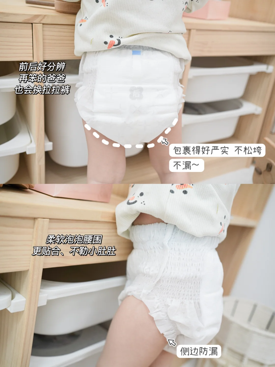 穿起来很贴合宝宝的身形,柔软的泡泡腰围。不勒红小肚肚,而且一提就穿、一撕就脱,再笨的爸爸也能轻松学会😝
