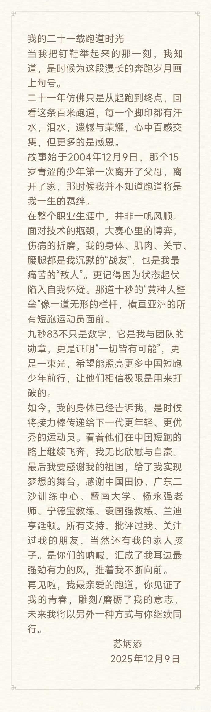 致敬苏神!9.83是一座高山,等待着后人去攀登与超越! 12月9日上午,男子100米亚洲纪录保持者、中国短跑名将苏炳添发布微博宣布退役。 2025年11月20日,36岁的苏炳添完成了他职业生涯的最后一跑。 2014年,他想过退役,然后坚持到2015年,跑出9秒99,成为首位闯入世锦赛男子百米决赛的亚洲人;2017年,他想过退役;然后坚持到2018年,两度跑出9秒91;2019年,他又考虑退役,然后坚持到东京跑出9秒83,成为首个跑进奥运会男子百米决赛的中国飞人。 苏炳添选择在12月9日退役的原因:“其实我不是说到现在自己接近退役的时候才想这个事情,主要是以前也想过。我就想着,从哪一天开始,在哪一天去结束,应该是一个最完美的选择。因为我是2004年12月9日,从一个普通的中学进入到业余体校,我一直会记住这个日子——因为对我来说印象很深。所以说,我觉得比完全运会,应该告别的日子还就是今年的12月9日,刚好21年。” 苏炳添前半程世界顶级,后半程国内顶级,属于越跑越慢的那种,这也可能是在世界大赛不出彩的原因,世界田径短跑顶级运动员基本都是越跑越快的,这个领域黑人太占优势了,黄种人这个成绩已经不错了,能在田径短跑类项目上彻彻底底打败黑人的,有且只有刘翔一人,爆发力加技术组合这样,单纯爆发力100米几乎不可能! 致敬苏神,广东,中国,亚洲飞人。 谁说黄种人不能跑进985,以后可能有中国年轻人跑进980,因为苏神用实绩引领他们:“我们可以。”