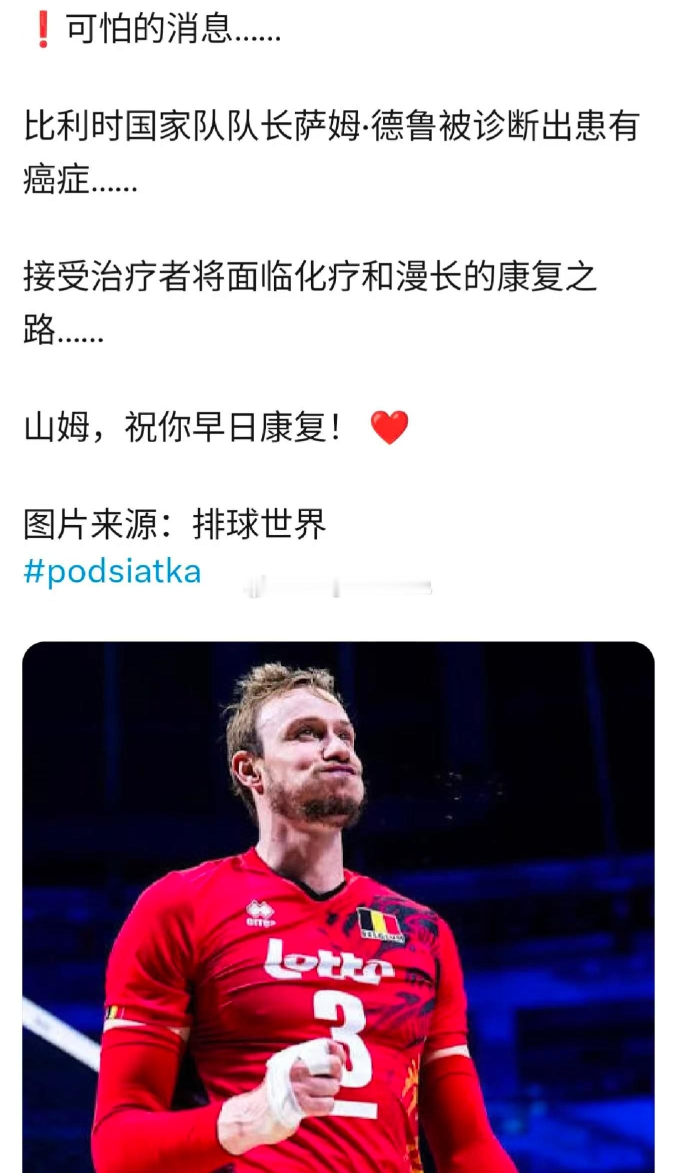 噩耗,目前效力于俄超火车头队的比利时男排队长萨姆·德鲁被诊断患有癌症,他将接受化疗,俱乐部表示将会继续履行合同。德鲁的女友是保加利亚前国手拉巴德捷耶娃。祝福早日康复重返赛场。中国男排
