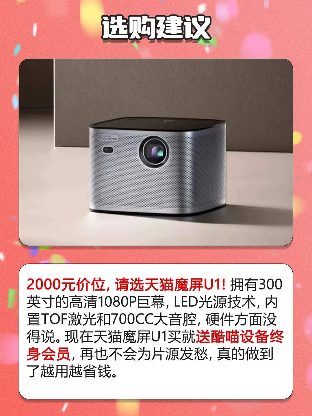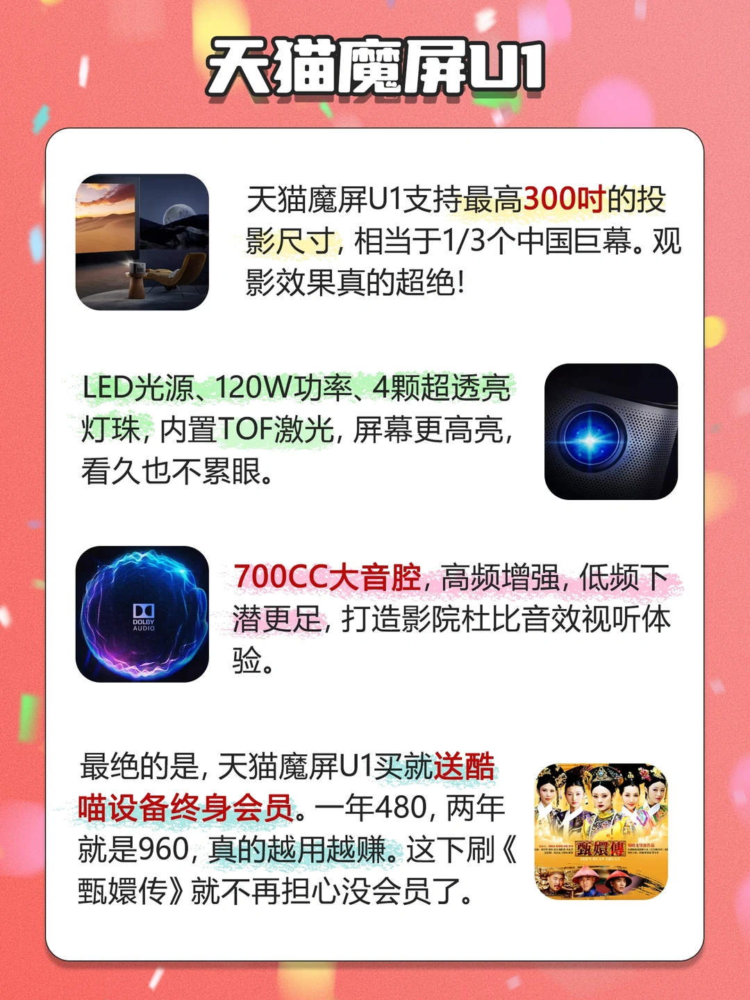 🟢 天猫魔屏U1有着300英寸的高清1080P巨幕,LED光源技术,满血激光技术和700CC大音腔🎶!买就送酷喵设备终身会员❗这下就再也不会为片源发愁了。已知酷喵SVIP一年需要480元,两年就能省出1000元,真的做到了越用越省钱💰。有此诸多优秀性能的同时,仅两千多,年货节各种买赠,性价比超高!天猫魔屏U1的这个价位硬件配置没的说,福利也已经安排的明明户白。