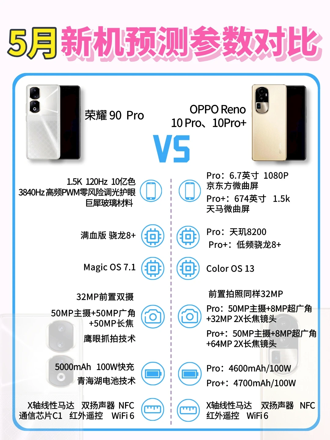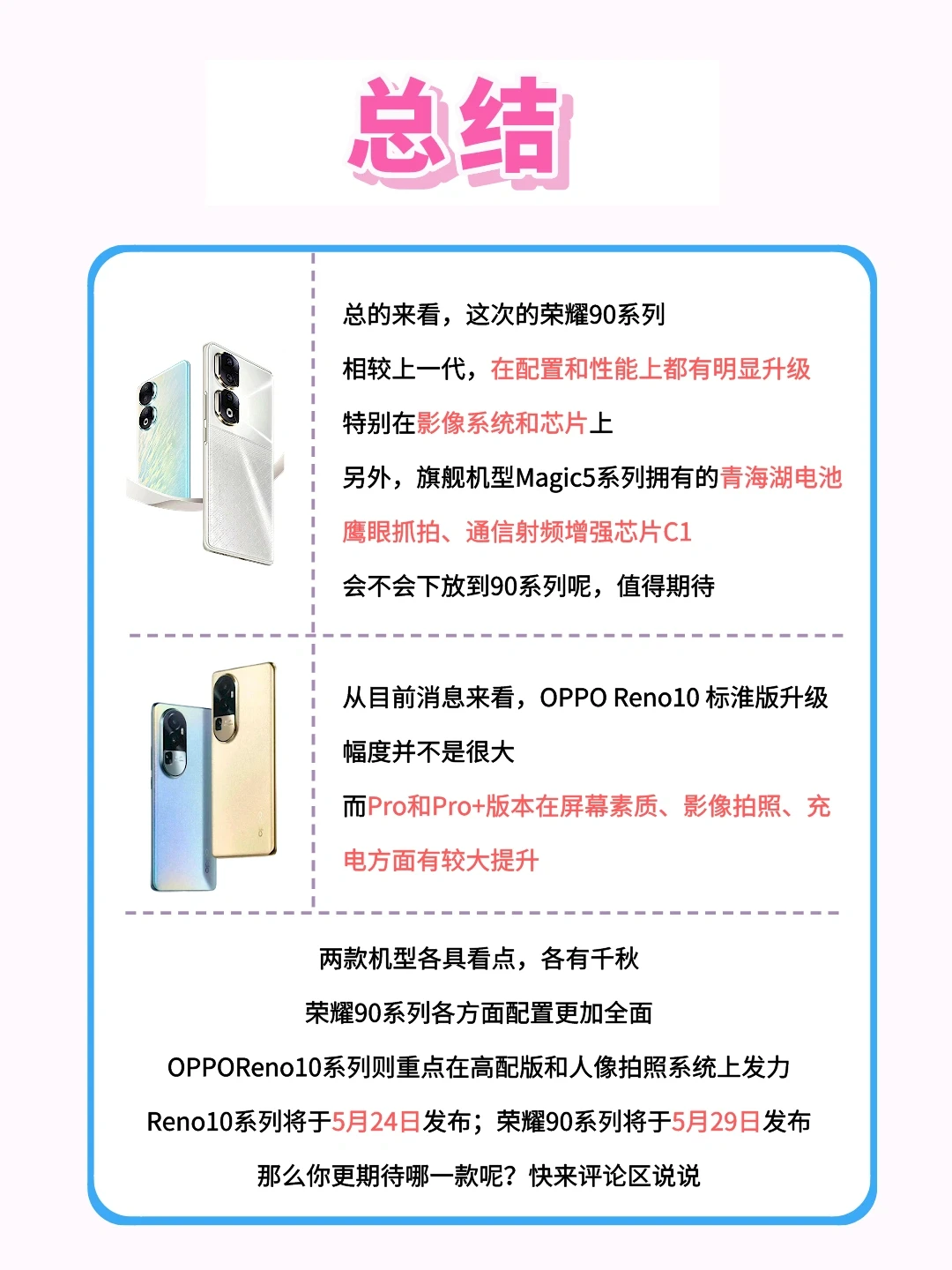 OPPO Reno10系列将于5月24日发布;荣耀90系列将于5月29日发布。那么你更期待哪一款呢?快来评论区说说