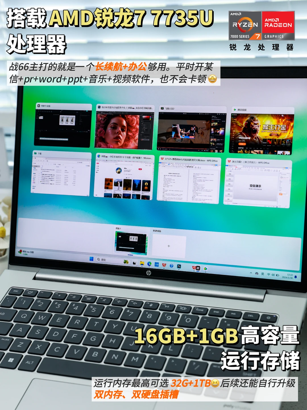 搭载AMD锐龙7 7735U处理器,使用起来低温低噪,且手感冰冷不发烫。运行内存最高可选32G+1TB,后续还能自行升级。