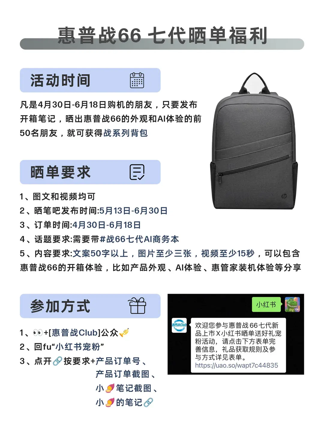 凡是4月30日-6月18日购机的宝,只要发布“惠普战66七代”开箱使用笔记,前50名朋友,即可获得战系列背包(价值¥89)