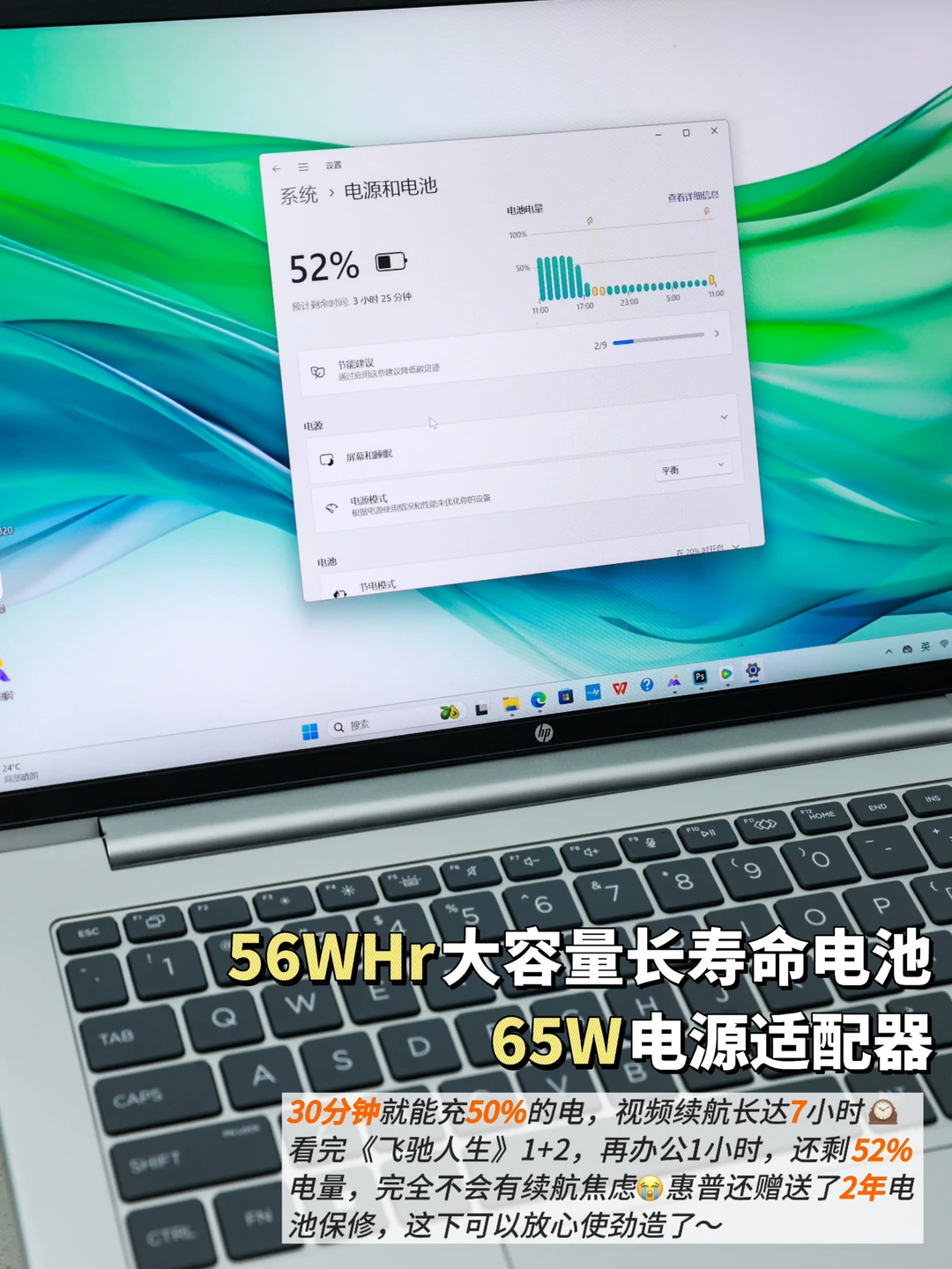 56WHr大容量长寿命电池,30分钟就能充50%的电。实测观看4小时《飞驰人生》1+2之后,仅用掉41%的电。惠普还赠送了2年电池保修,这下可以放心使劲造了~