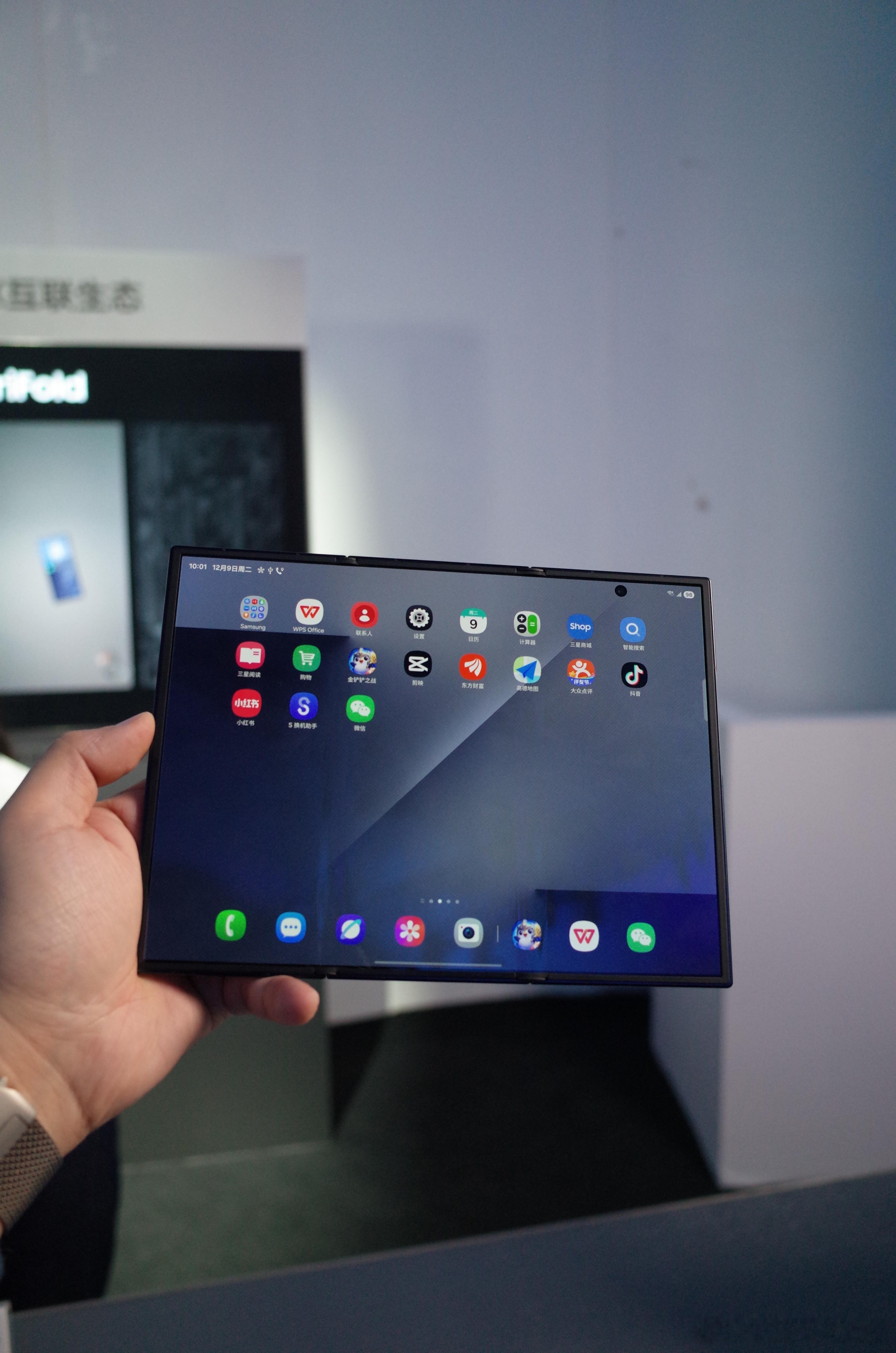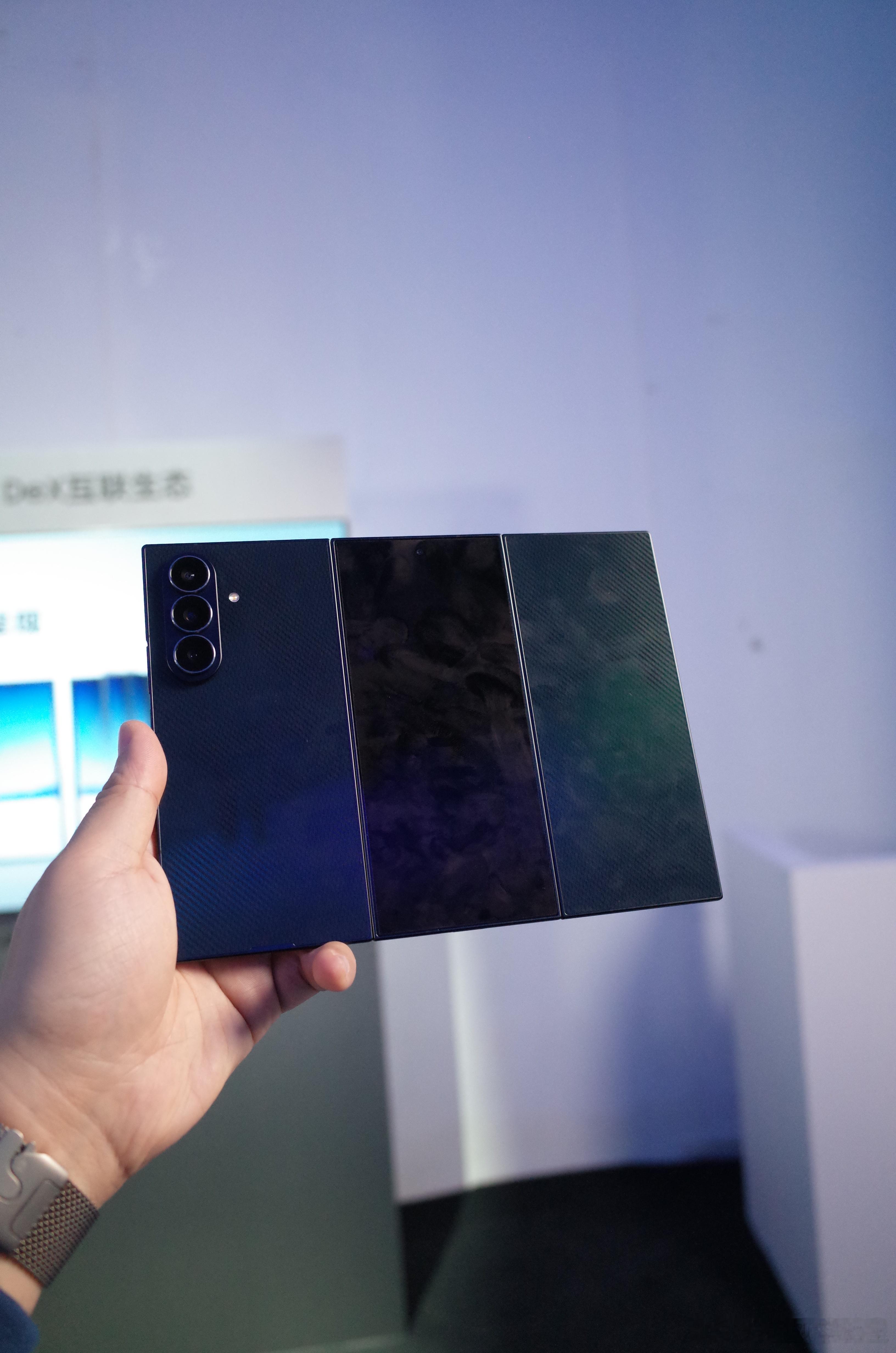 三星三折叠Galaxy Z TriFold 上手,三折叠终于迎来了第二个品牌了。整体的手感非常扎实,符合三星折叠屏产品一贯的水准,配置和Fold7几乎没有差异,电池容量来到了5600毫安时,支持最高45W有线充电。三星三折叠相较于华为Mate XTs 最大的不同是采用了内外两块屏幕,内屏在平时被保护的非常好,重量和手感却没有因为多一块屏幕而变得很累赘,16+512G售价19999元,16+1TB售价 21999元,你们觉得咋样? 三星GalaxyZTriFold三星首款三折叠手机发布