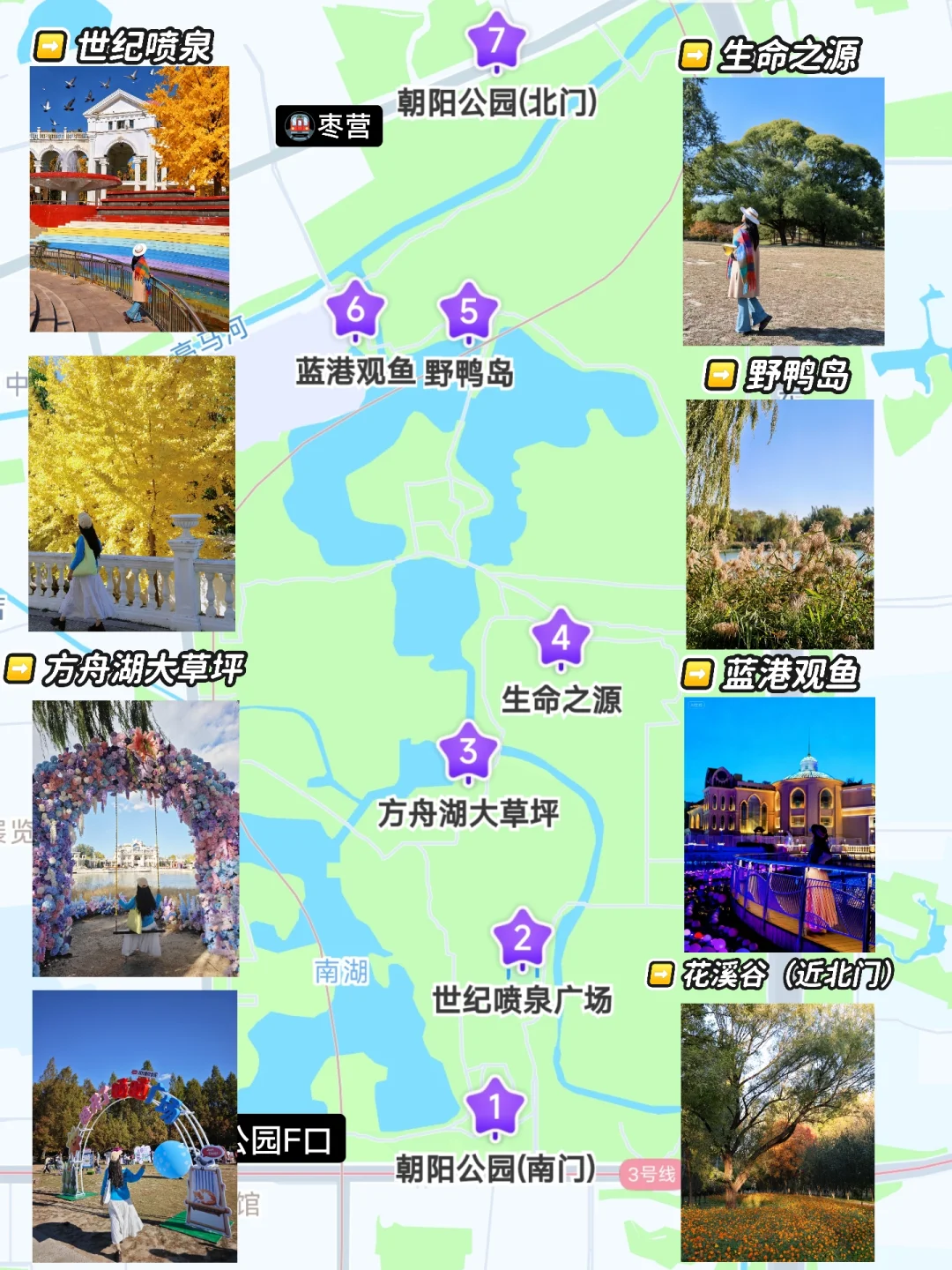 南门进-世纪喷泉-方舟湖草坪(泡泡玛特对面)-生命之源-野鸭岛-蓝港观鱼-花溪谷(近北门)