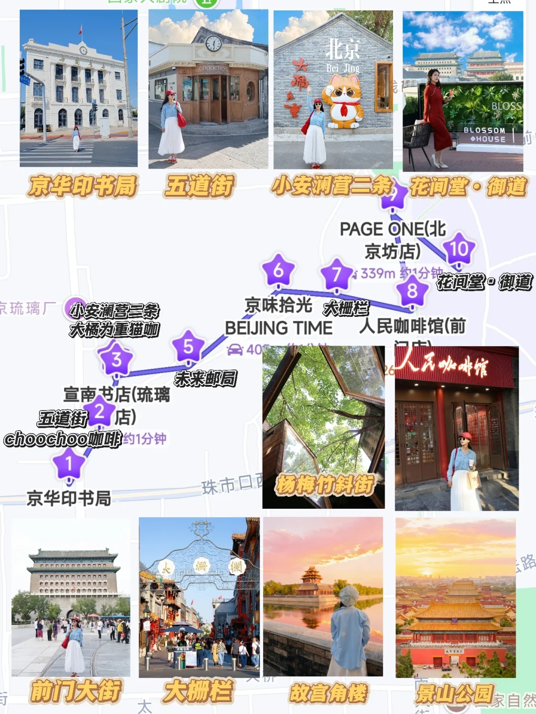 京华印书局→五道街→小安澜营二条→杨梅竹斜街→前门大栅栏→北京坊→故宫角楼→景山公园→鲜鱼口街住宿(花间堂·御道)