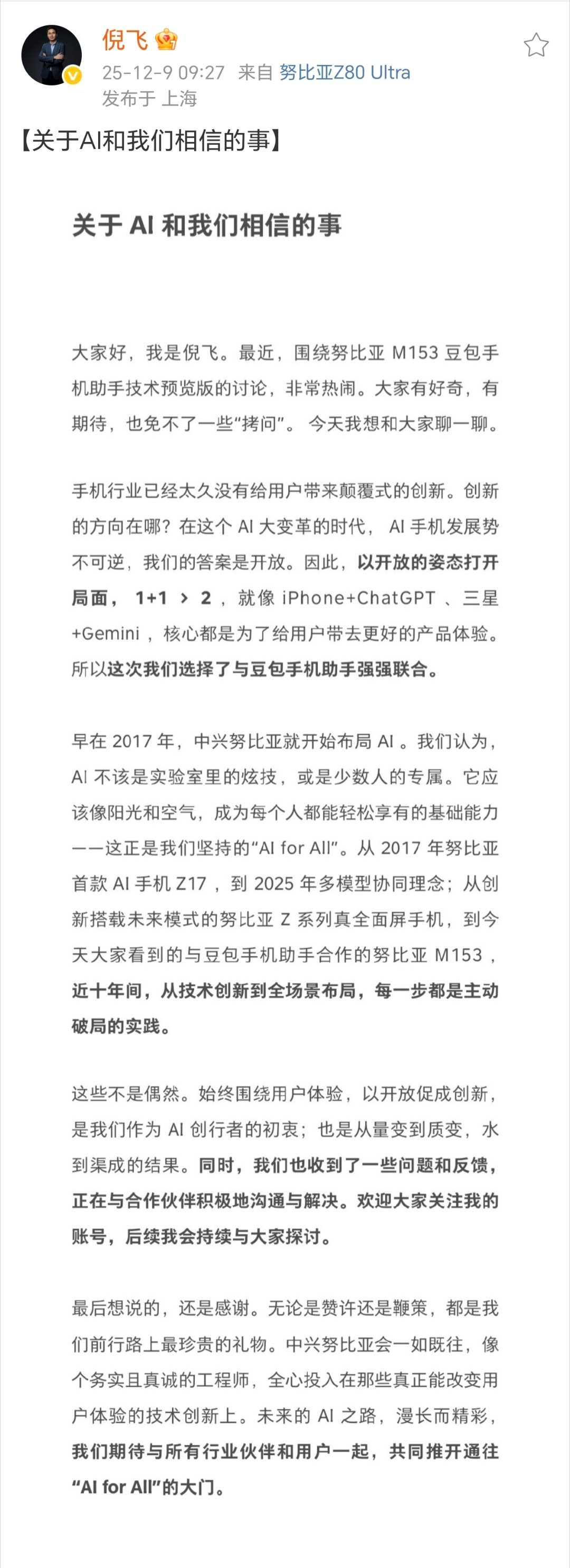 努比亚总裁倪飞回应豆包手机单纯AI手机努比豆的出现让人眼前一亮,个人觉得只有大家劲往一处使,不闭门造车,保持开放姿态,让未来AI手机走得更远!