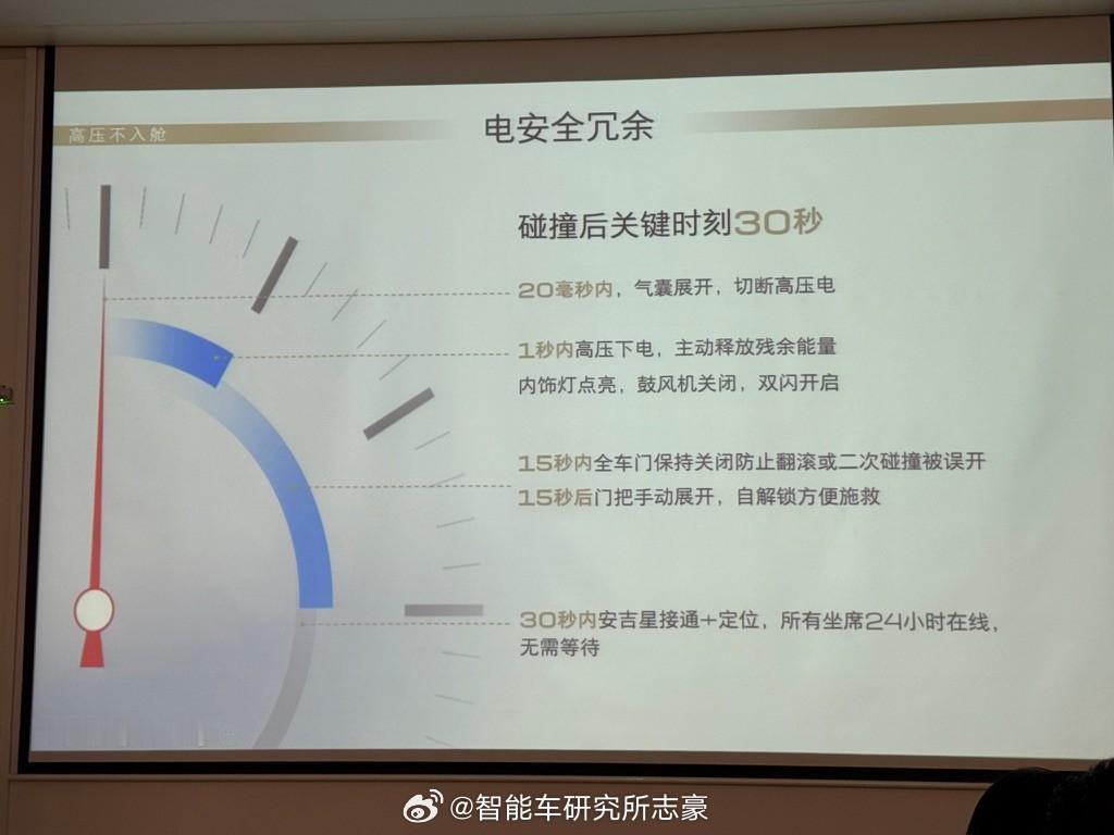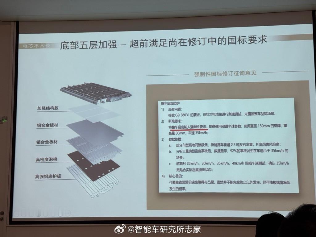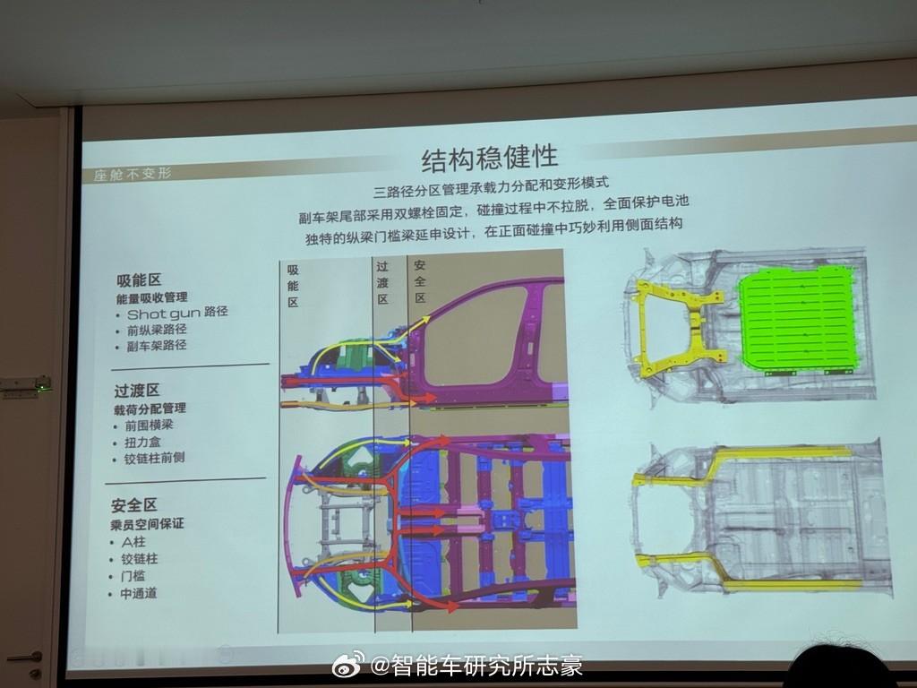 通用的别克至境对当下大电池,高压电车怎么兼顾安全,他们的做法和一些思考,我觉得蛮有收获的。结论就是:宁愿牺牲底盘很多空间和成本,去给安全布局,给安全留空间。1、电池包跟副车架留白,给碰撞溃缩留空间。在底盘,寸土寸金的底盘上,大家都在挤空间,卷续航。至境L7副车架,跟电池,留有一定的空档(碰撞缓冲区域),这有点“非主流”。毕竟上汽系内部真要做个400+km 大电池增程那是分分钟的事,所以他们真的是不想卷,不是卷不了。·电池包的安全冗余用料设计。除了底盘布局设计外,别克至境就电池包设计都有很多硬件的安全冗余设计,各种底护板、铝合金隔板、加强胶水、高温瓷化胶全部用上。所以电池包本身的热传递、所以又是一场空间、重量和电池容量的博弈。·高压包不进仓:高压包是恶意避开,布局乘员舱外;·高压线不进仓:拉电线肯定是两点之间直线最短,材料最少最便宜。但通用宁可绕远一点,花钱也要避开乘员舱。·碰撞后的断电策略:所谓救援黄金30秒,这期间车会发生:20毫秒内:气囊全开,切断高压电;1秒内:高压下电,主动释放残余能量。内饰阅读灯点亮、鼓风机关闭、双闪开启。15秒内,全车门保持关闭,防止翻滚/二次碰撞误开15秒后,电子门把手弹开,自动解锁方便施救。30秒内,安吉星接通+定位。24h坐席在线,无需等待。其实细节还有很多的,理论电池包的疲劳测试,跟车架一样甚至要高于车架,开到车架老化电池包也不能有金属疲劳,扭曲。实验室模拟高温环境50度,故意让单电芯热失控后,继续使用两周车和电池包都没有热失控,能继续用。甚至车架以及电池包单独的各个角度的碰撞、翻滚测试,各种测试都是拉满的。所以,既然大电池高压平台是趋势,不可逆。那就做足测试验证,我觉得如果行业内其他品牌,都有这样的实验和测试结论,大家都可以拉出来,因为安全真的是对消费者选购一个非常大的加分项和信心。