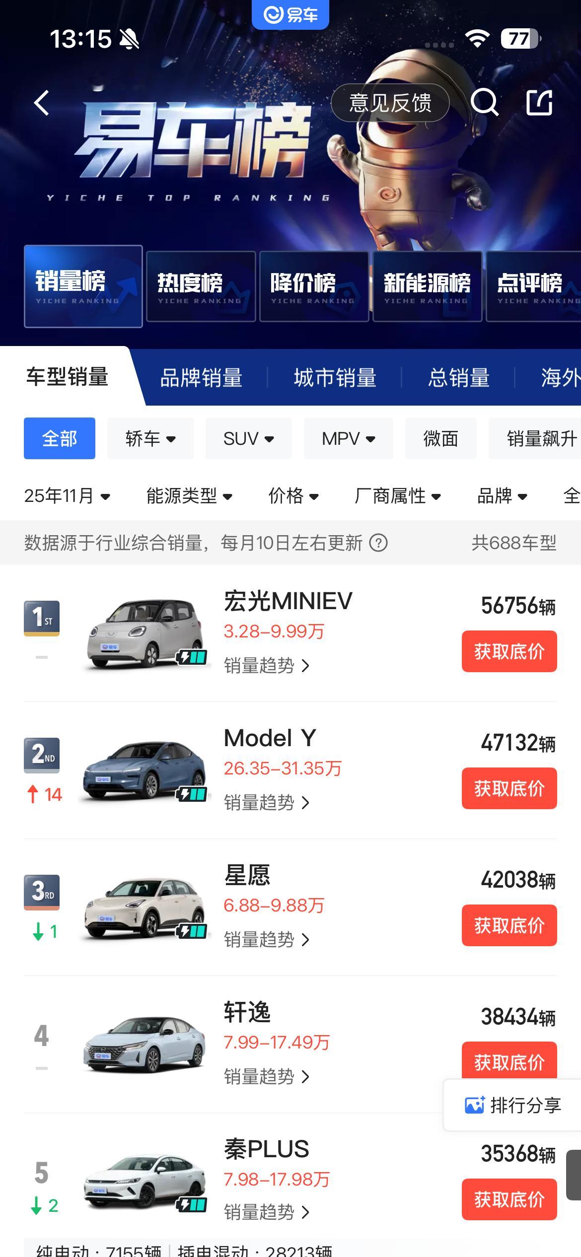 11月不加任何定语的汽车销量排行榜正式出炉!Top1:宏光MINIEV,这台车没有普天盖地的营销,有的只是能满足寻常家庭最基本用车的需求!这样一台小车月销5.6w,背后也是代表5.6w个家庭!Top2:Model Y,上个月Model Y的销量不足两万台,为了挽回销量下滑带来的颓势,11月上新Model Y的长续航版本官标续航达到了821km,不得不说,从市场反响来看,消费者确实喜欢长续航的车型,这下月销量重新回到月销4w,逼近5w台。Top3:是咱们的吉利星愿,月销4.2w辆,无论是底盘用料,还是空间大小都要比同级车好上不少,能取得这么好的成绩和它的产品力分不开!阿远说车汽车销量