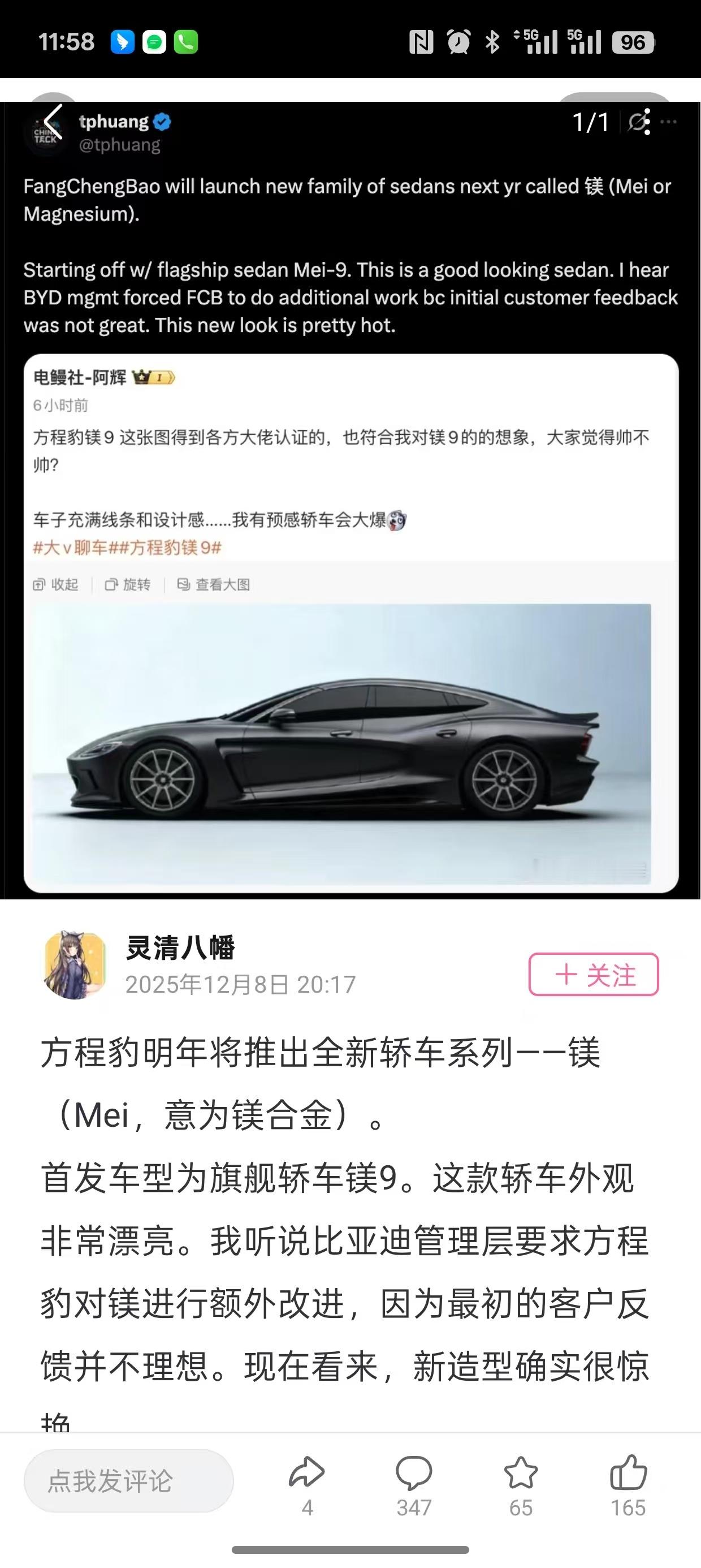 网传方程豹旗舰轿车的预测图,机盖看着很战斗同时也不失优雅,后门看起来非常有力量感,比起隔壁汉和汉L那规规矩矩的中登大叔感三厢造型要高级多了,不知道明年有没有希望跟SU7L对轰一波小米三款新车齐曝光方程豹汽车大v聊车