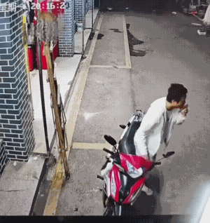 小伙子停下摩托车后,下来刚站好,就被倒下的梯子砸中了头和肩膀。 实话实说,若不是肩膀也挡了一下,估计小伙子的头得开瓢。 小伙子心里很生气,认为有人故意整自己,可他却找不到肇事者,因为肇事者逃逸。 不过,视频很清楚,估计看动态图的你也看到了肇事者。