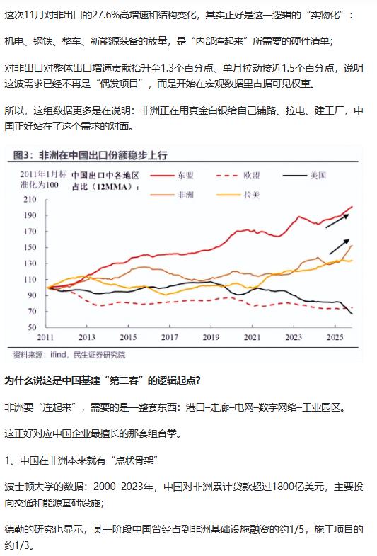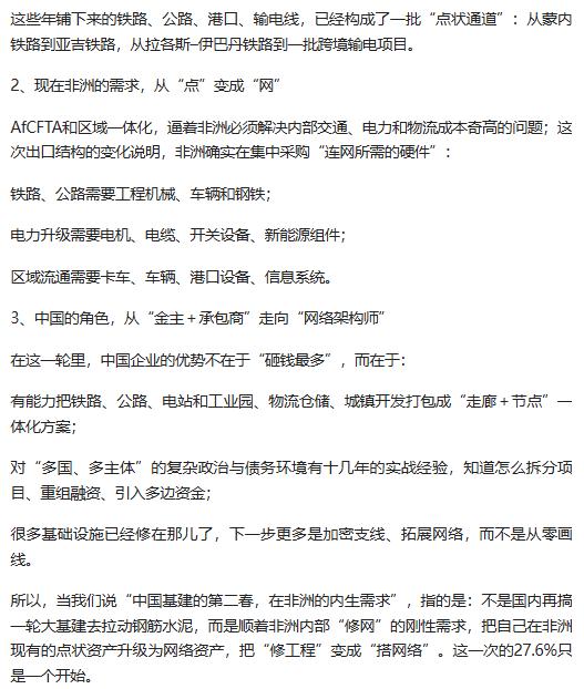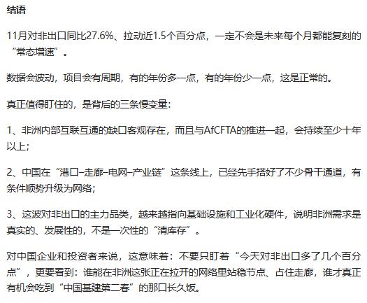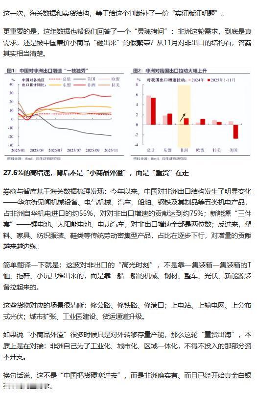 中国对非出口猛增 27.6%,机电、新能源等 “重货” 成主力,对接非洲内生基建需求,中非贸易迎来高质量新态势! 原文来自:诗与星空,《中国对非出口猛增27.6%的背后:从援助,到非洲自己要的真需求》