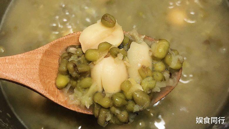 绿豆煮沸后,转小火继续煮一段时间,直到绿豆开始微微开花。这时,将莲子放入锅中,与绿豆一起煮。莲子的加入让锅中的香气更加浓郁,莲子的清香与绿豆的豆香相互交织。