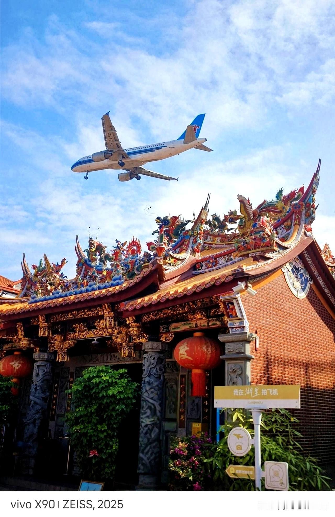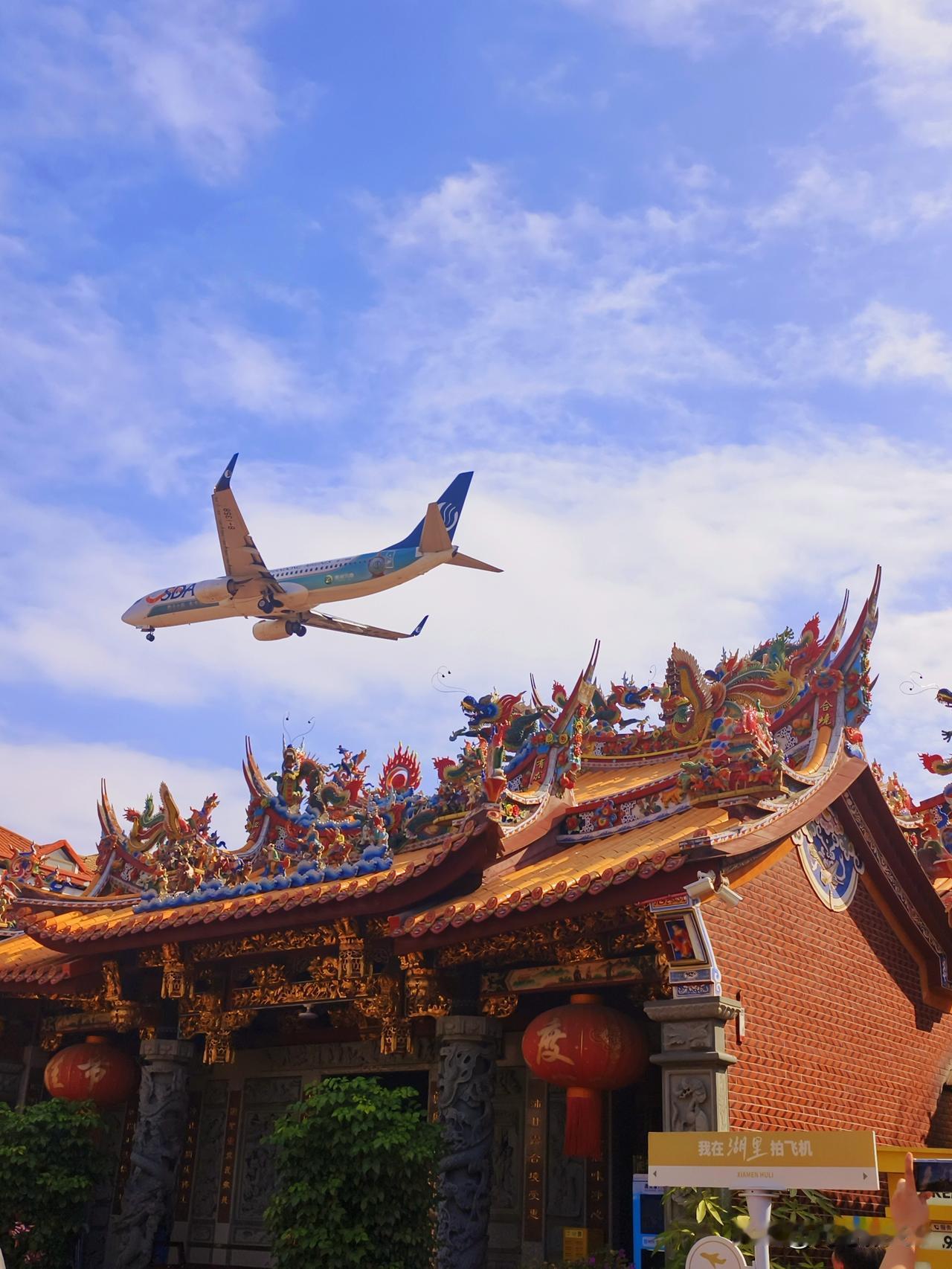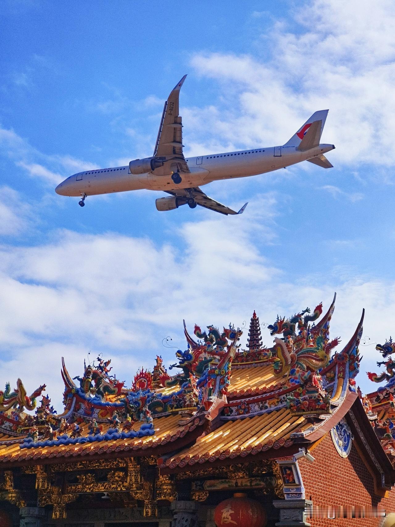 跨越古今的邂逅 飞机在高空中平稳飞行,阳光洒在它光滑的机身上,反射出耀眼的光芒。它那流线型的机身,犹如一道灵动的弧线,在天空中勾勒出属于现代的轨迹。而下方的庙宇,则是一幅古朴而典雅的画卷。那黛瓦青砖的屋顶,如鱼鳞般层层叠叠,在阳光下闪烁着深沉的光泽;翘起的飞檐,仿佛是振翅欲飞的鸟儿,蕴含着古人对天空的浪漫遐想,这是一场跨越古今的邂逅!飞机风景摄影 清晨天上的飞机