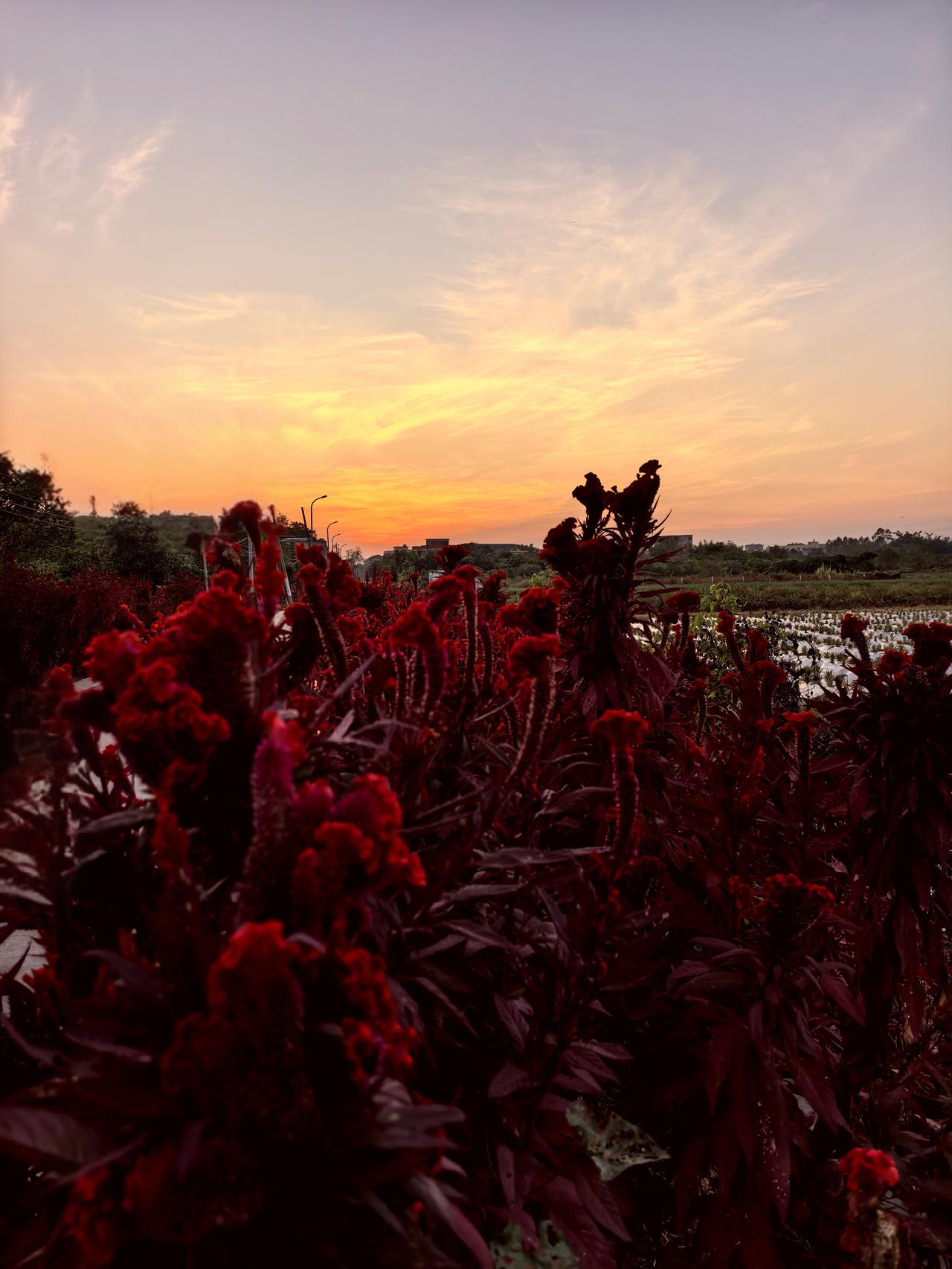 落日余晖染透天,鸡冠红焰耀田边 2025年12月9日傍晚,落日余晖将天边染得通红,路边则被火红的鸡冠花点亮,那景象美如画卷,宛如老天爷随意挥毫的杰作。落日余晖洒落在花丛中,火红的鸡冠花在晚照里似是饮了烈酒,艳丽至极。 眼前花与余晖交织的画面令人沉醉。“落日余晖映晚霞,绵绵心事向天涯”,有人在这美景中涌起了思乡之情,有人则单纯地享受着这份宁静美好。生活中的小确幸,就藏在每一个落日时分。 夕阳 晚霞