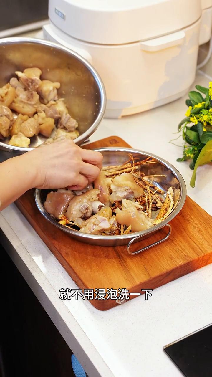 猪脚大家别再红烧着吃了,试一下客家的经典吃法:干蒸猪蹄,出锅香味扑鼻,实在太好吃了。 ·今天去市场本来是想买排骨的,看到猪脚挺新鲜的,就临时改了主意,买了一个猪脚回来。 ·先用温水洗干净了再来焯水,可以多煮一会把脏东西煮出来。 ·撇干净浮沫后就不用再清洗了,每一块夹出来的时候在水里抖一抖,这样就很干净了。 ·趁热腌制它能更好入味,加上屏幕上的这些简单的调料,多抓一会把调料抓匀,然后再加上花生油,这样腌半个小时就很入味了。 ·趁着这个时候来泡一些五指毛桃,选一些根相对细一点的容易出味。隔一段时间我就会用五指毛桃来给家人煮水或者是做菜,温水泡半个小时。 ·泡完了之后先拿出来铺在盘底,泡过水就很容易出味。如果是用来煮水或者是煲汤就不用浸泡洗一下,可以直接用。 ·猪脚放上去后盖上保鲜膜,防止倒汗水的同时也能更香。冷水或者水开上锅都没关系,水开了算时间,蒸40分钟左右,保鲜膜记得要用耐高温的。 你看这个蒸出来是不是特别有食欲?猪脚吃起来QQ糯糯的,还夹着五指毛桃的椰香,还有蒸出来的汤汁,用来拌饭可香了,喜欢的朋友可以去试一下。 我是小坏,喜欢我的视频请您点赞收藏哦!点赞关注收藏!