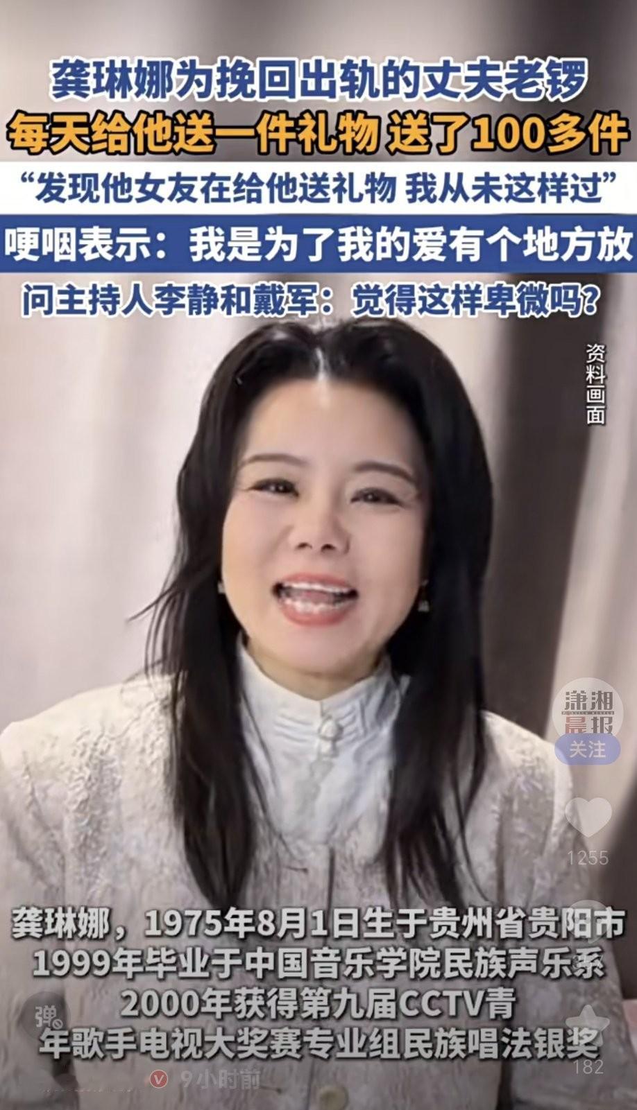 龚琳娜为挽回出轨的丈夫老锣,每天给他送一件礼物,送了100多件。 2024年他们官宣离婚,看似和平,实则是老锣婚内出轨。爱上的是个离异带孩子的中年妇女。 龚琳娜知道后没直接离,而是想挽回。她去德国,看到老锣女友给准备了20多件礼物。她反思自己,开始每天给老锣准备一个礼物,送了100多件。她哽咽说这是治愈自己的方式,让爱有处安放。可惜最后还是离了。 A网友:都出轨了,这还留着干嘛?给自己添堵吗?当初他是欣赏你的声音才追求你的,难道现在你的声音变了吗?现在不爱了,那就潇洒点,转身走,自己有才华有能力,何必呢? B网友:要把你的爱,送给懂你、爱你的人才会被珍惜,你也是个名人,吃喝不愁,不用伏低迁就他,分开可能会痛,但放眼人生只是一小段。学会放下,你的痛苦才会变短,干嘛拿人家的不珍视来折磨自己,给自己留点时间,多出去走走,让心情美丽。 爱情里,有时候努力了也不一定有好结果,希望你早点遇到珍惜你的人,看到你价值的人。