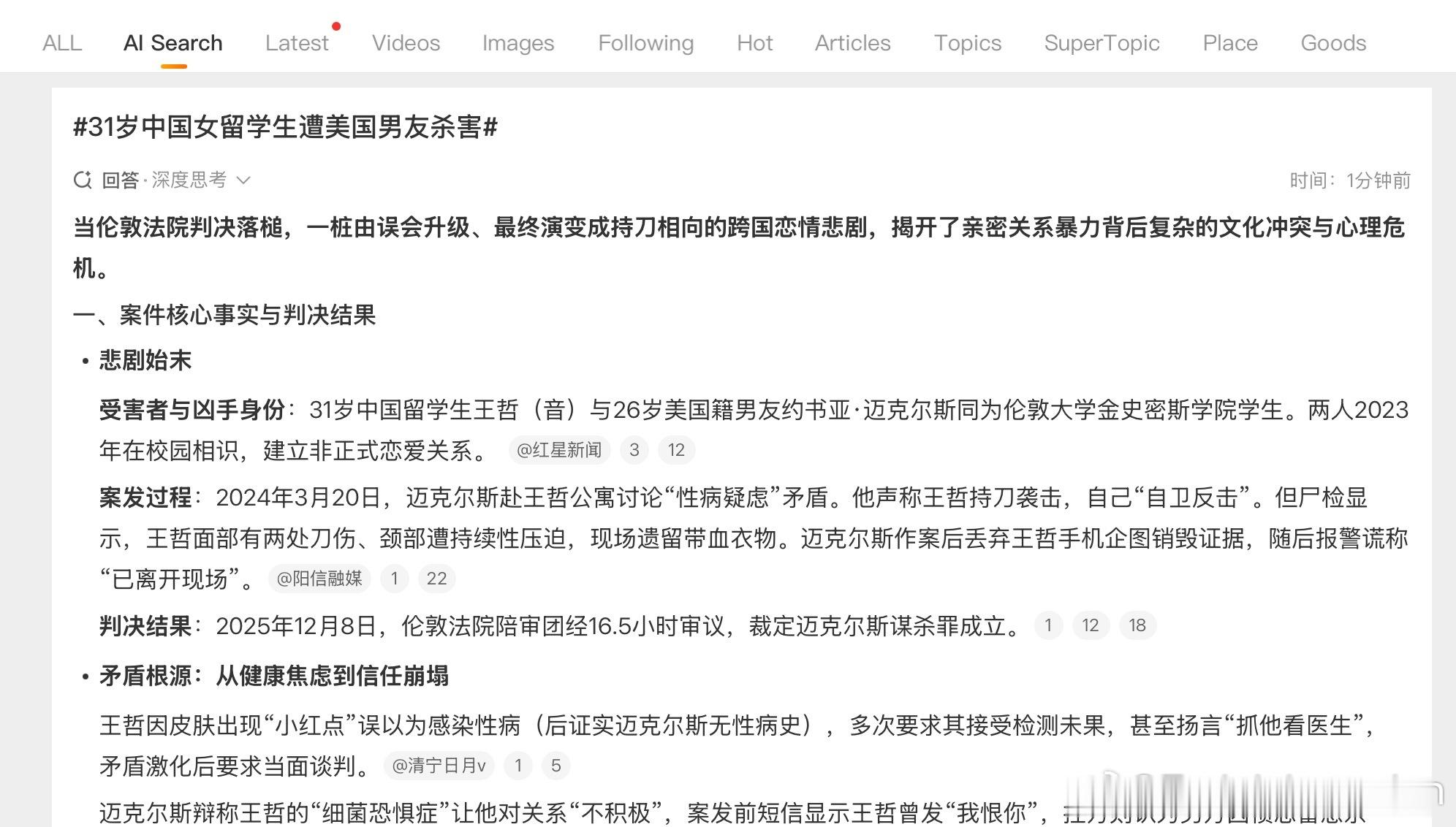 31岁中国女留学生遭美国男友杀害我觉得微博对这条新闻的AI分析就很离谱。犯罪就是犯罪,杀人犯就是杀人犯,这和“文化冲突”有什么关系呢?杀害他人在任何文化里都是不可接受的事情。不要把罪犯的过失归结到“文化冲突”上,也不要因为对方是外国人就为其错误找所谓的“客观原因”。