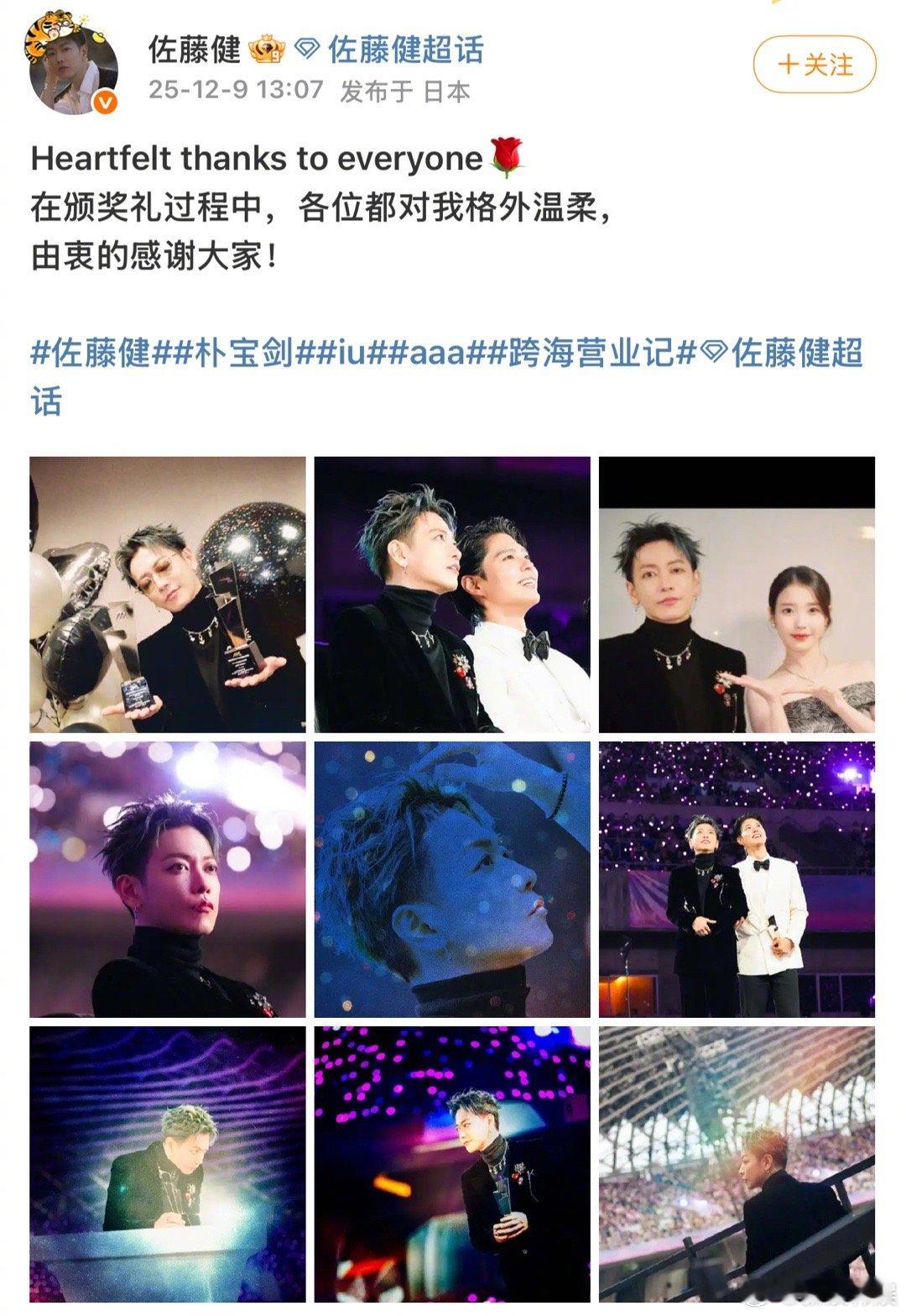 佐藤健合照IU朴宝剑 AAA的售后持续进行中,今天佐藤健也加入更新阵容,公开和IU、朴宝剑同框合影。虽然当晚被调侃“陷入语言真空区”,但是突然释出的惊喜合照,也让人更好奇他们幕后的互动细节!