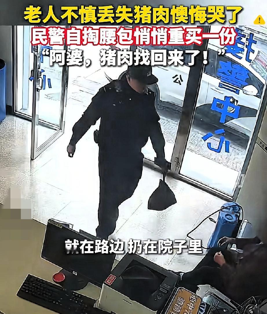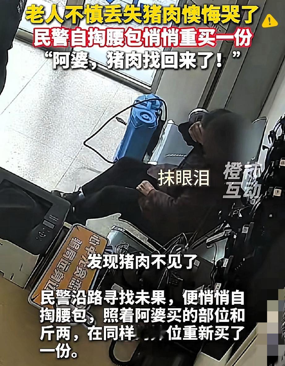 这民警也太暖了! 浙江阿婆丢了66块的猪肉哭红了眼,民警找不着,直接自掏腰包买了同款,还骗阿婆“找着了”,这细节真的戳心窝子。 对阿婆来说,那不是一块普通的肉,是攒着过日子的心意;对民警而言,这也不是多花点钱的事儿,是护住老人的体面和安心。 很多时候,善意从不是惊天动地的大事,而是懂对方的难,悄悄给个台阶下。 我们总说“为人民服务”,这就是最实在的样子——不是冰冷的流程,是把别人的委屈放在心上,用小动作裹住柔软的善意。 这才是让人踏实的温暖,比任何口号都有力量。 你遇到过这种不动声色的善意吗?当时是不是也跟着暖到了?