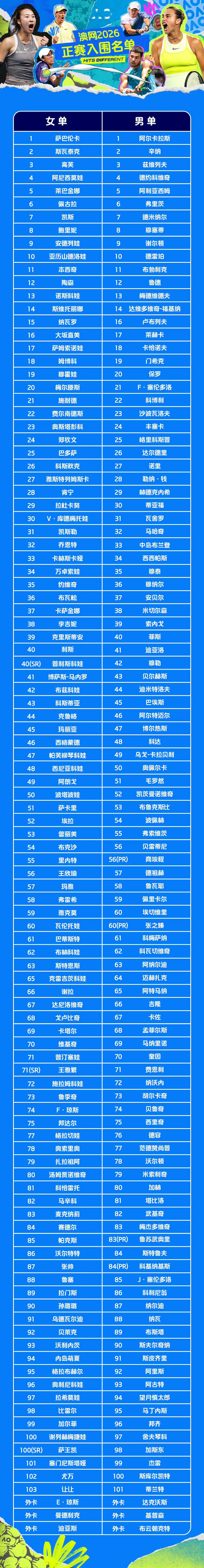 澳网2026 正赛名单出炉🔥男单:世界第一阿尔卡拉斯追梦全满贯,辛纳冲刺三连冠、德约科维奇冲击澳网11冠 ,小布持亚太区外卡入围,张之臻、商竣程使用保护排名入围女单:由世界第一萨巴伦卡领衔,郑钦文、王欣瑜、王雅繁、张帅出战。1.12 ~ 2.1澳网和大家在墨尔本公园不见不散中国七人入围澳网单打正赛澳网