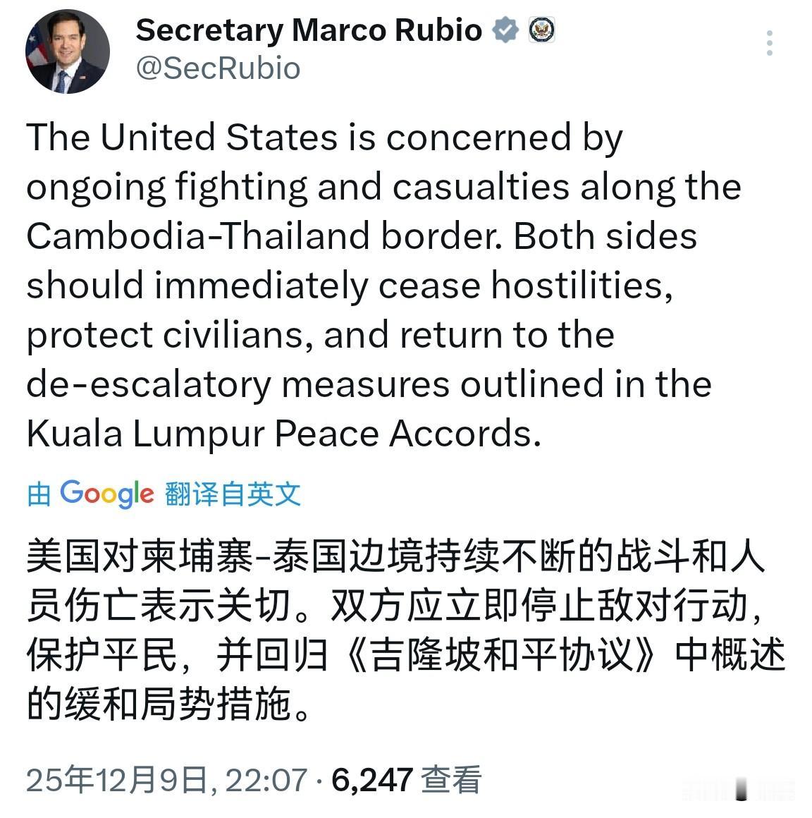 卢比奥发文:“美国对柬埔寨与泰国边境沿线持续的冲突和人员伤亡表示关切。双方应立即停止敌对行动,保护平民,并恢复执行《吉隆坡和平协议》中规定的缓和局势措施。” 卢比奥的这段表态,语气是十分温和的。既没有点名批评,也没有表达不满,只是象征性地呼吁泰国和柬埔寨“立即停止冲突,保护平民,恢复执行《吉隆坡和平协议》”。 要注意,这份协议是在美国的积极撮合下达成的。如今,这才过去几个月,双方就无视协议再次开火。结果,美国却连一句重话都没有讲。 这意味着什么?意味着美国要么不想管了,要么它知道自己管不了了。