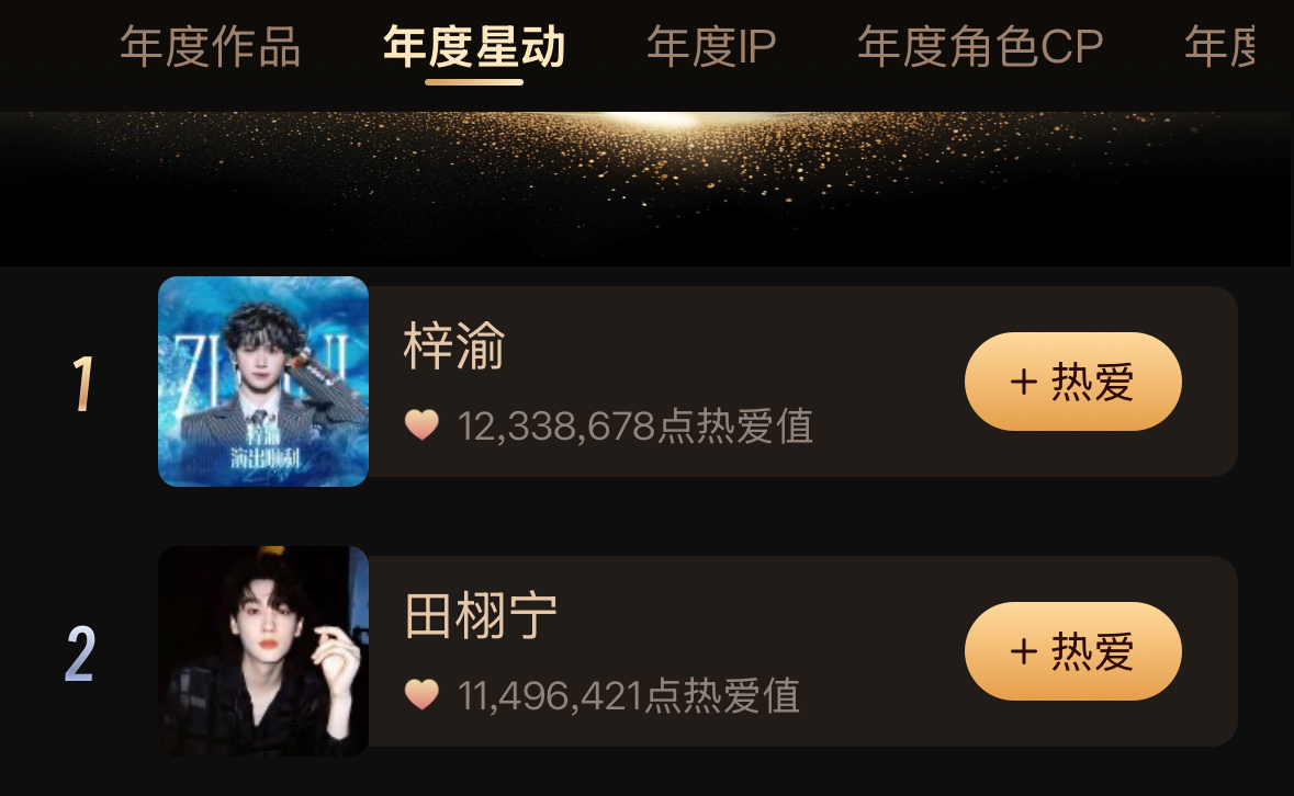 年度星动,新晋双顶流梓渝田栩宁排名1.2。都好🔥啊