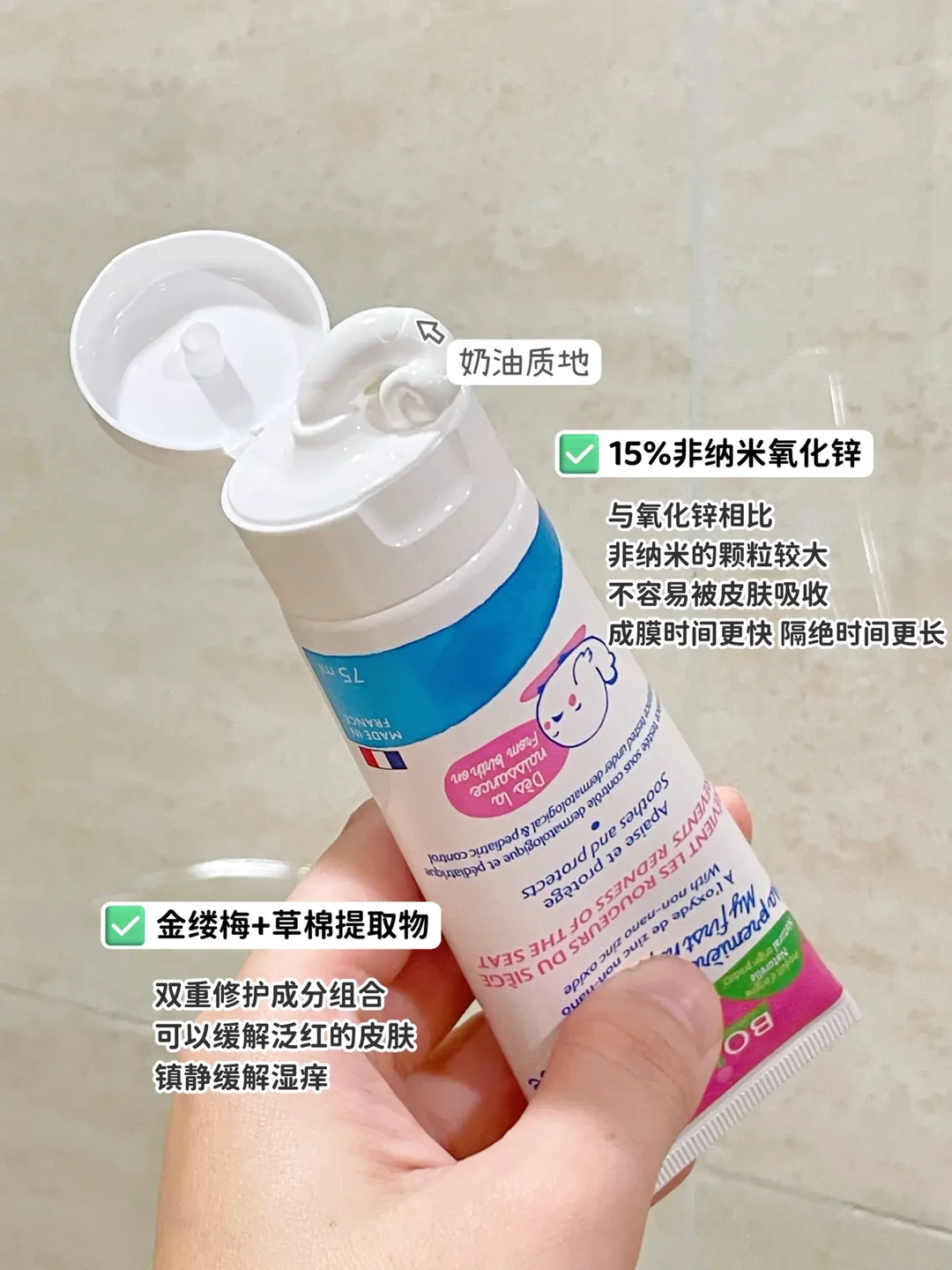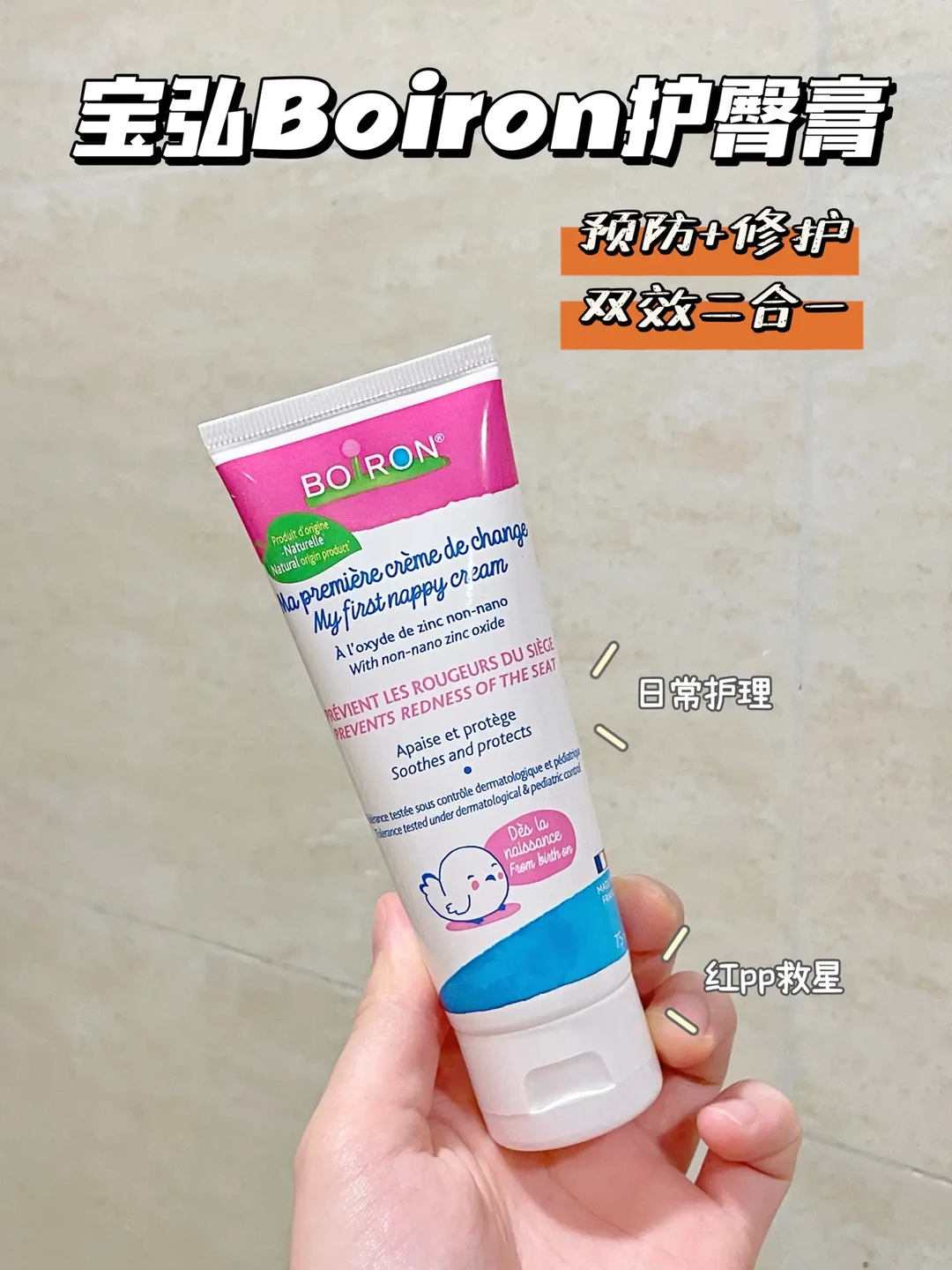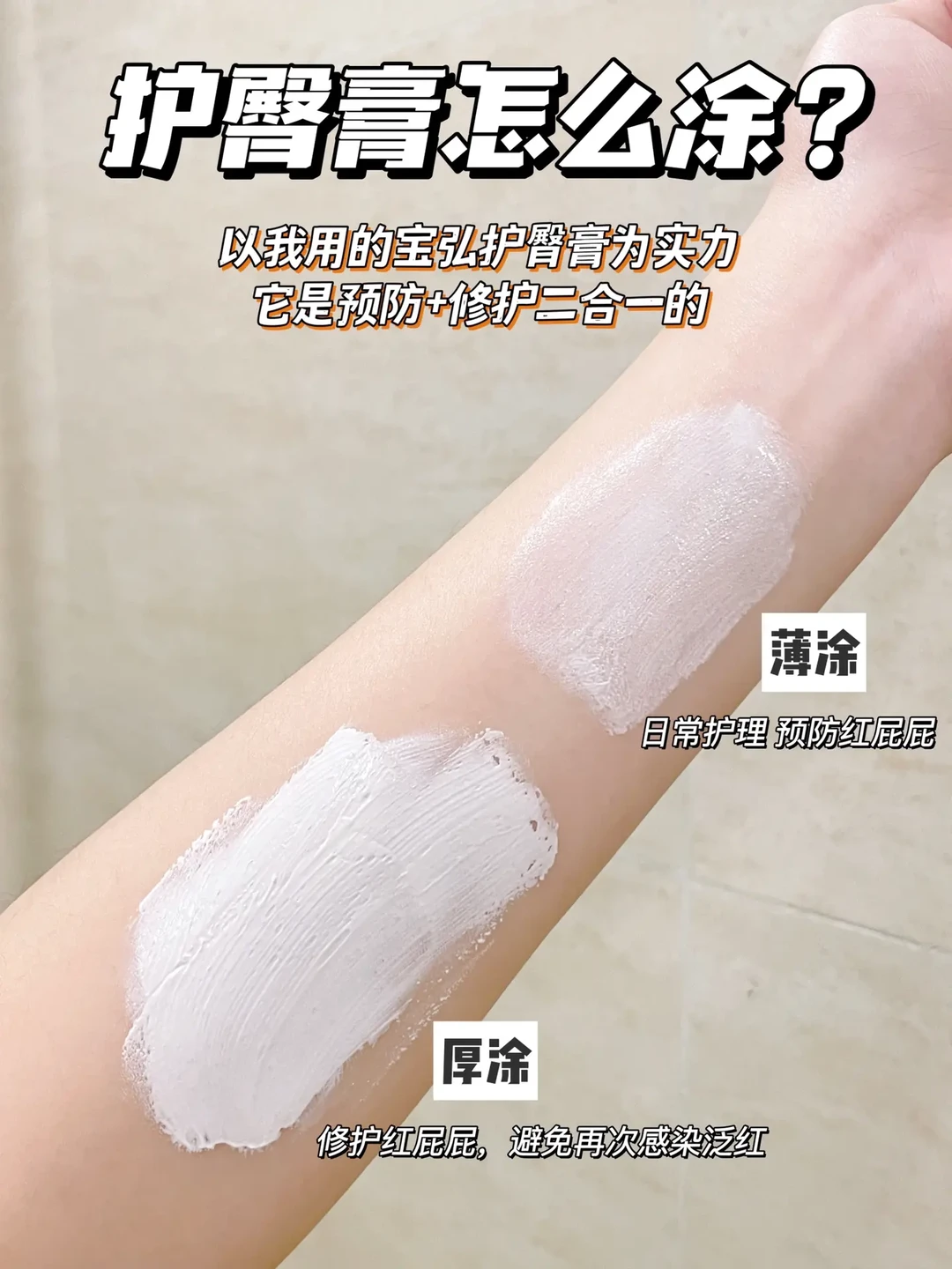 2️⃣护臀膏:每次洗完屁屁,都要晾干涂上护臀膏,隔绝尿便!买预防+修护二合一的,薄涂预防,轻微红屁屁就厚涂,一支就全搞定,推荐宝弘护臀膏,很好推开,15%非纳米氧化锌,不易被皮肤吸收,成膜快,隔绝时间长,防水真的绝,快看上图!