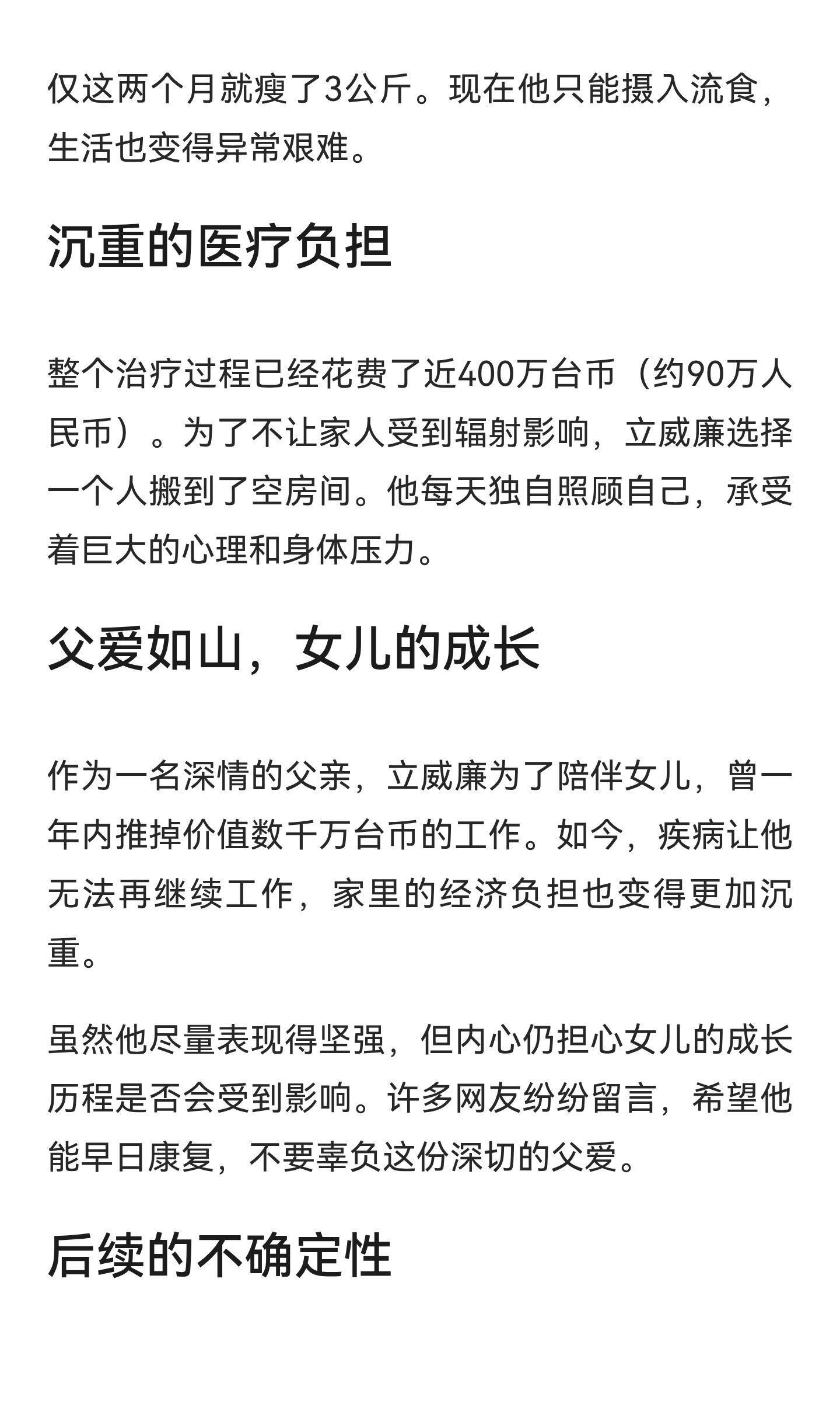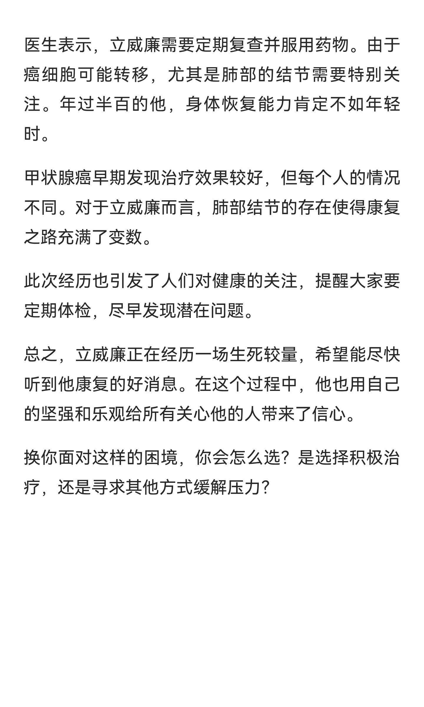 突发!知名男演员立威廉甲状腺癌二期立威廉确诊甲状腺癌二期,已接受两次手术,身体虚弱,生活艰难。他面临沉重医疗负担和经济压力,同时担心女儿成长。医生提醒需密切关注肺部结节,康复充满变数。他以坚强面对,希望早日康复。