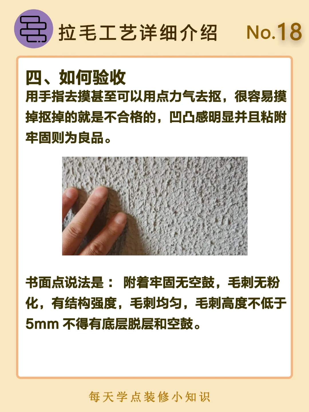 书面点说法是:附着牢固无空鼓,毛刺无粉化,有结构强度,毛刺均匀,毛刺高度不低于5mm不得有底层脱层和空鼓。
