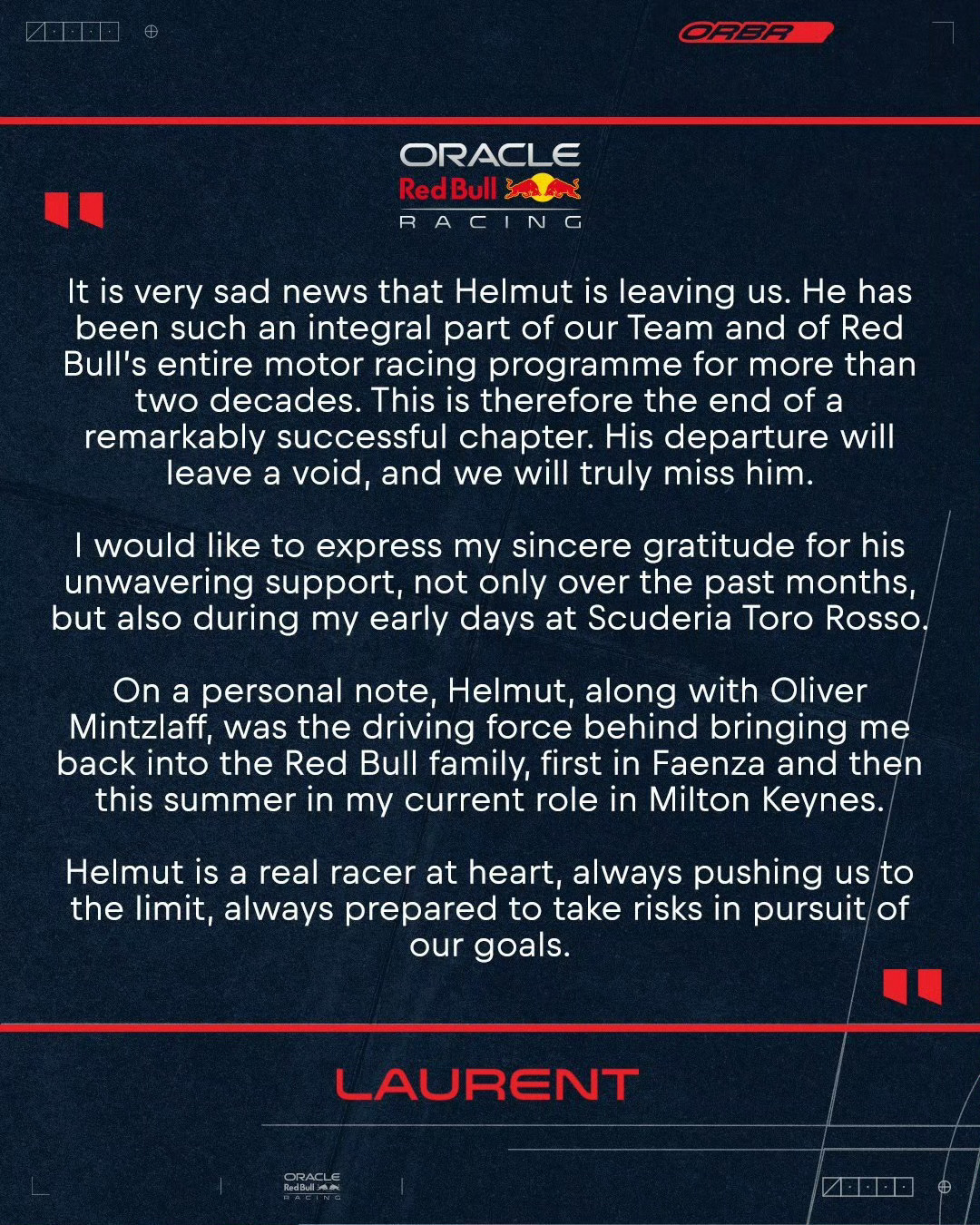红牛车队官方宣布:车队顾问赫尔穆特•马尔科博士将在今年年底离任!F1赛车