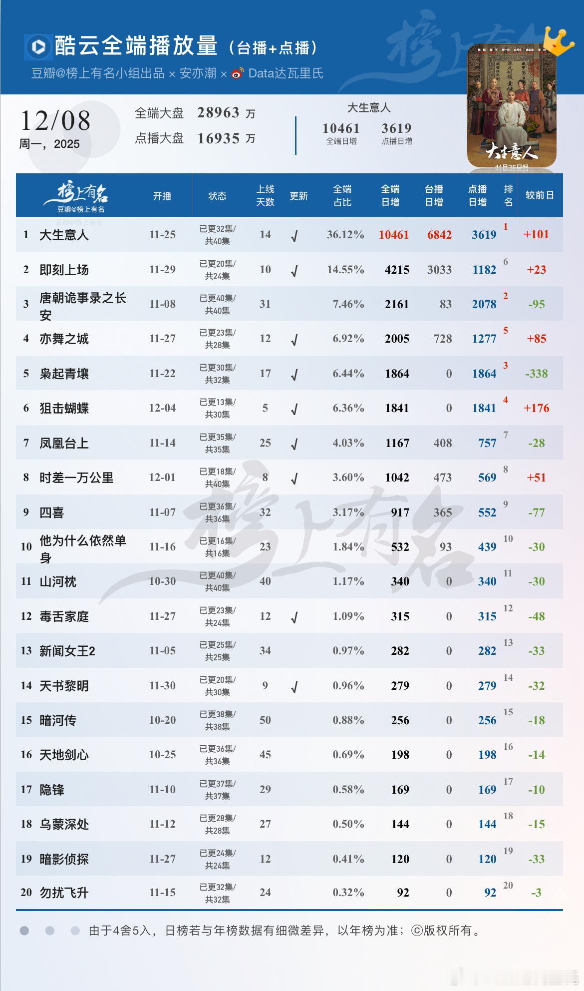 12.08酷云播放量🌴豆瓣榜上有名小组出品1 大生意人 全端日冠×10,全端破亿❗️ 10461 点播3619新高 +1012 即刻上场 4215 1182 +233 唐朝诡事录之长安 2161 2078 -954 亦舞之城 2005 1277 +855 枭起青壤 1864 -3386 狙击蝴蝶 1841 +1767 凤凰台上 1167 757 -288 时差一万公里 1042 569 +519 四喜 917 552 -7710 他为什么依然单身 532 439 -3011 山河枕 12 毒舌家庭 13 新闻女王2 14 天书黎明 15 暗河传 16 天地剑心 17 隐锋 18 乌蒙深处 19 暗影侦探 20 勿扰飞升 大生意人数据,大生意人酷云全端播放量破亿 ,全网热点共创计划 大生意人数据