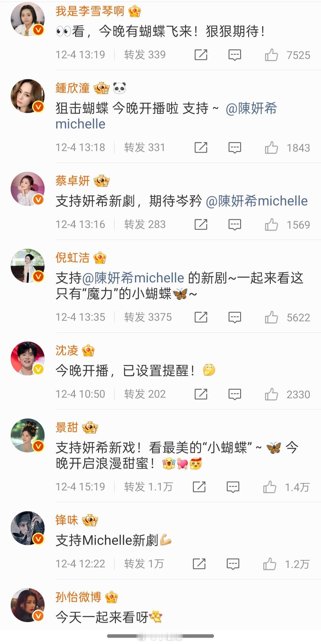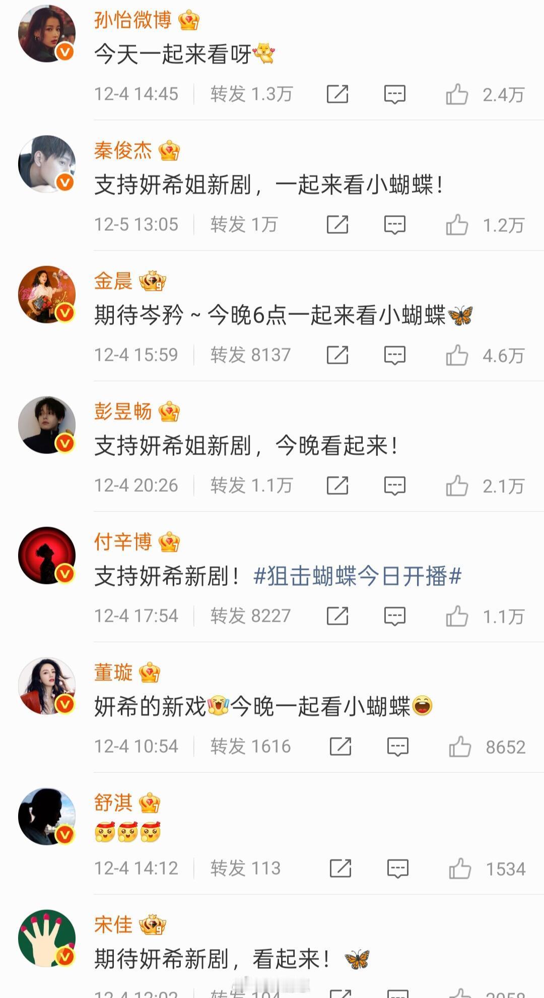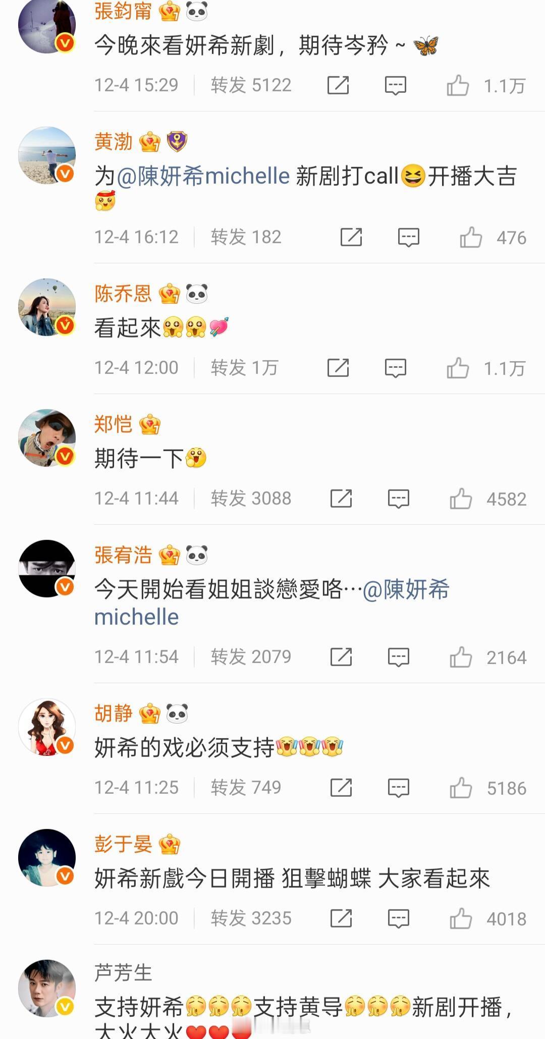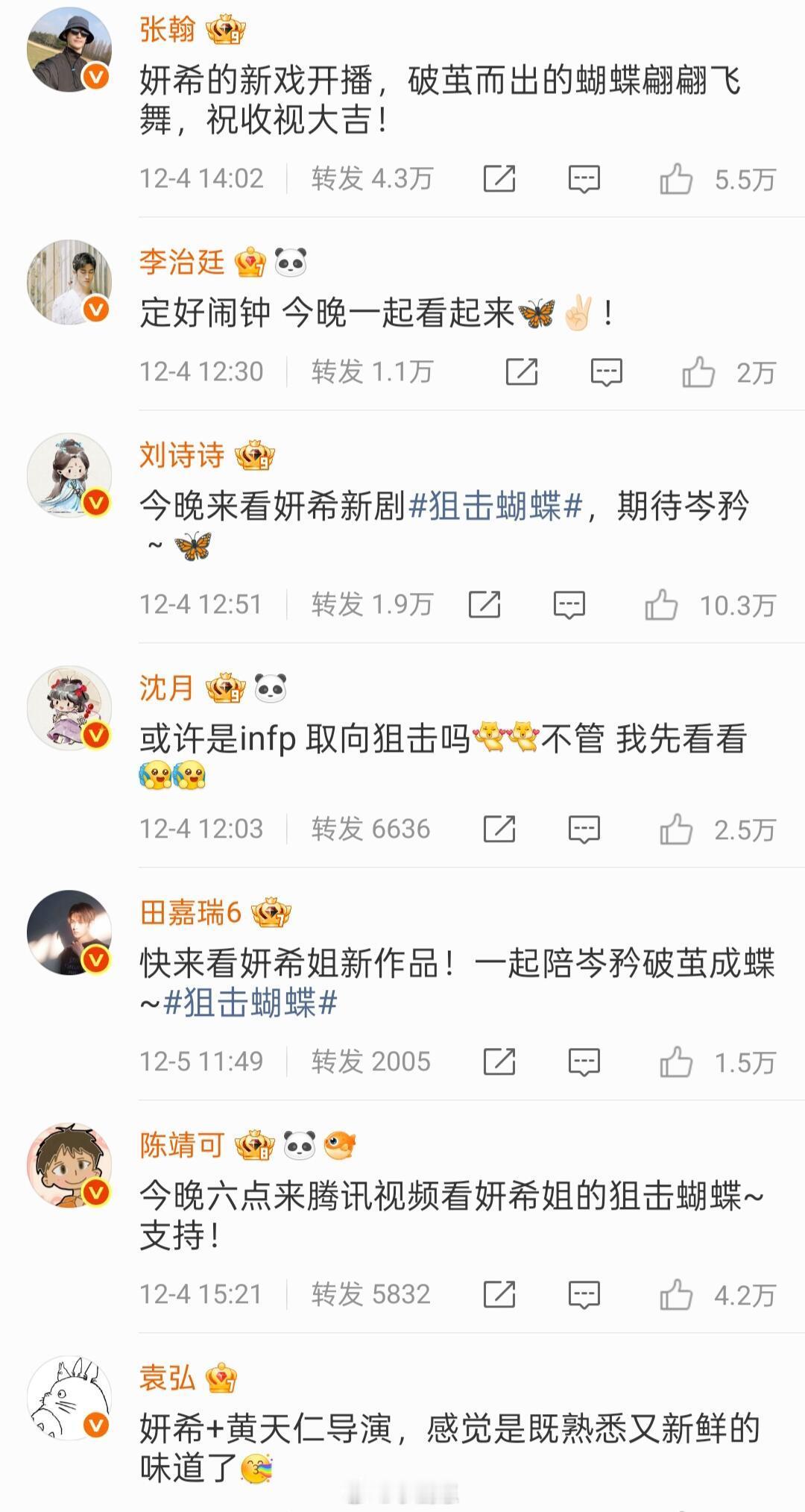 陈妍希的人脉好丰富和神奇呀!《狙击蝴蝶》开播,很多感觉跟她完全没有交集的艺人帮忙转发宣传,真的挺神奇的,感觉她人缘是真的好好呀!陈妍希‖狙击蝴蝶‖