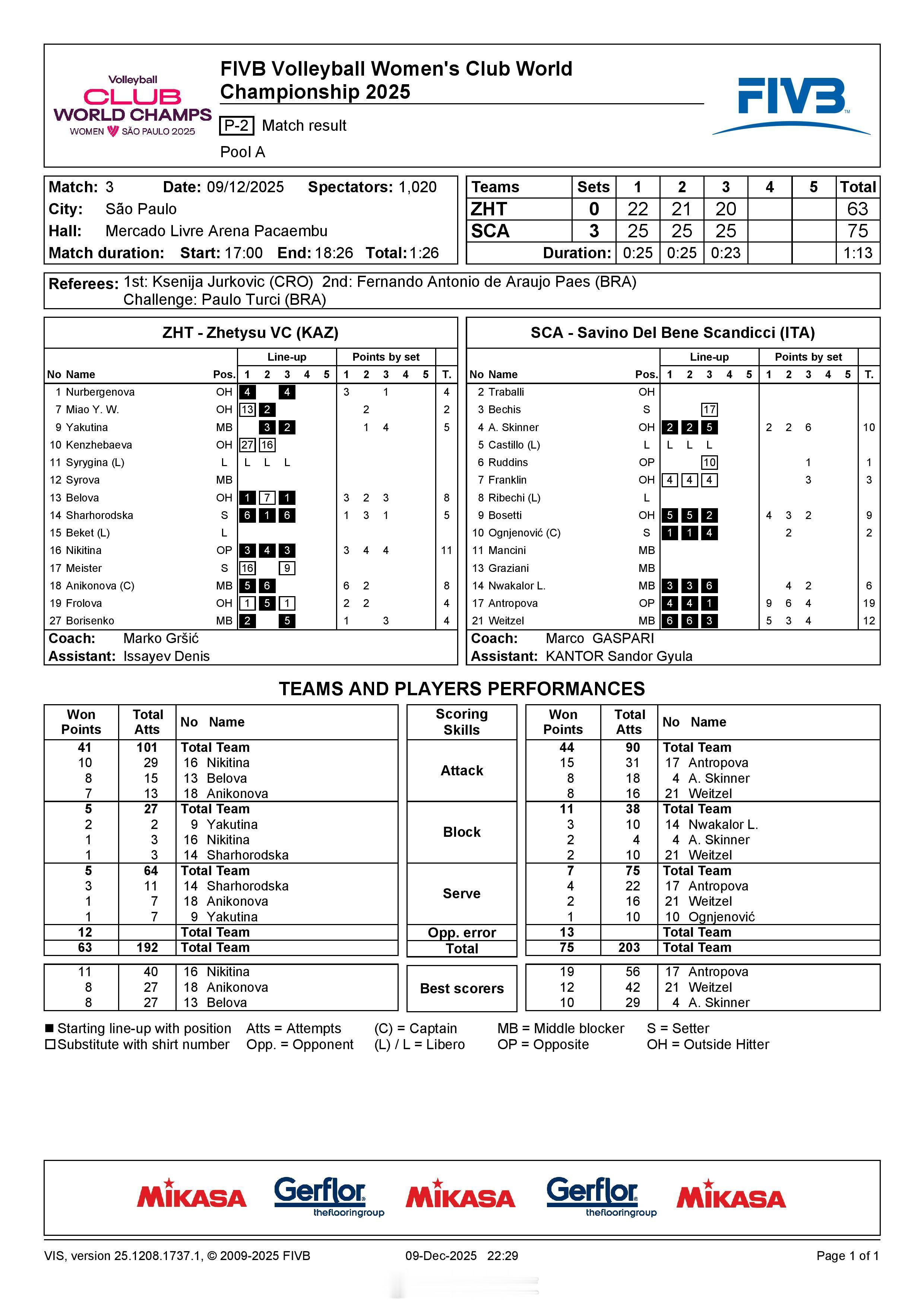 【2025女排世俱赛 小组赛:捷迪苏0-3斯坎迪奇】北京时间12月10日凌晨,巴西圣保罗,小组赛第1轮,A组的哈萨克斯坦捷迪苏以0-3(22-25, 21-25, 20-25)不敌意大利斯坎迪奇。缪伊雯 第一局局末替补、第二局首发局末再被换下共获得2分(6扣2中)。尼基蒂娜11分,贝洛娃、阿尼科诺娃各8分;安特罗波娃19分(拦4),韦策尔12分,A·斯金纳10分,波塞蒂9分。扣球41-44、拦网5-11、发球5-7、对手失误12-13。