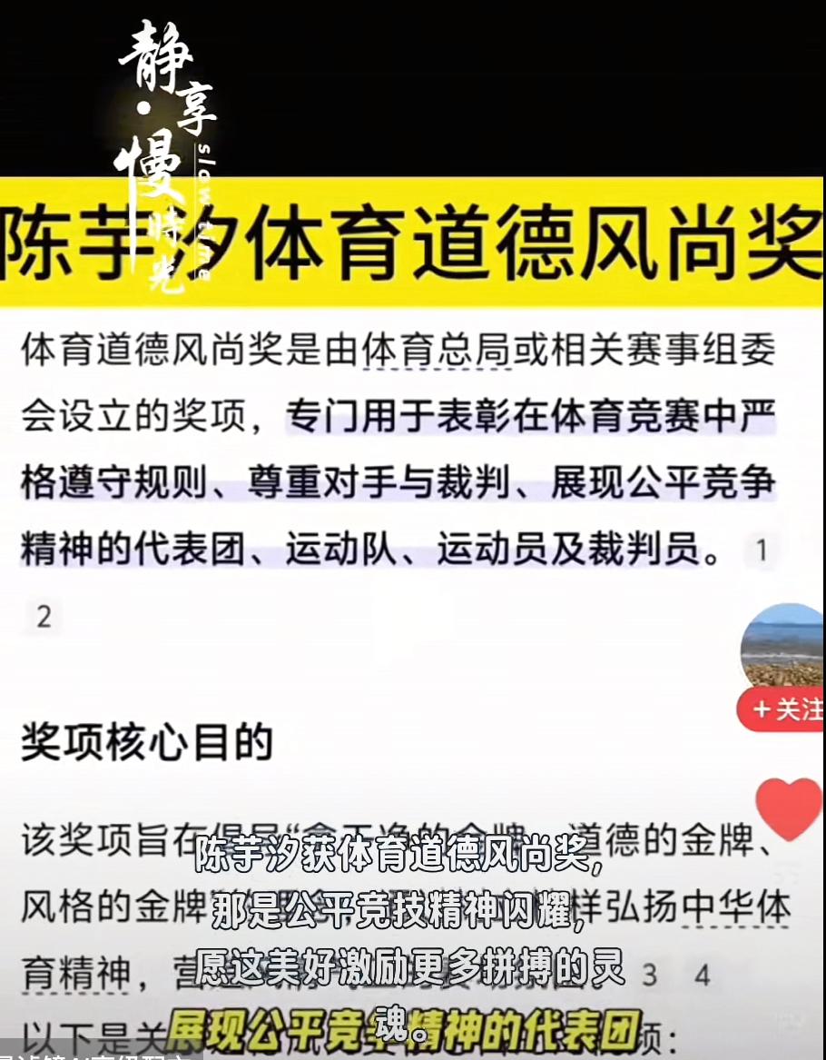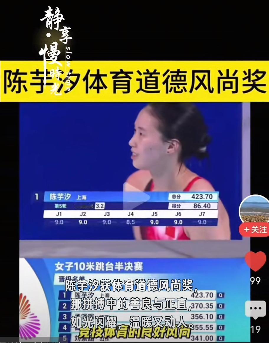 陈芋汐荣获“体育道德风尚奖”, 这一荣誉的意义早已超越奖牌本身。 它像一面镜子, 映照出竞技体育最本质的光芒一一 那不是领奖台上短暂的闪耀, 而是日复一日对规则的敬畏、 对对手的尊重、对自我的坚守。 这枚“无形奖牌”的重量, 胜过任何金属的质感; 它的纯净,源自灵魂深处的体育精神。 当光环褪去、水花平息, 真正留在历史长河中的, 从来不只是征服了多少高度与难度, 更是以怎样的姿态完成这一切。 这份认可, 是正义最沉稳的回—它不辩自明, 不喧自响, 在时光中沉淀出运动员最珍贵的底色: 干净比金牌更亮,品格比冠军更重。