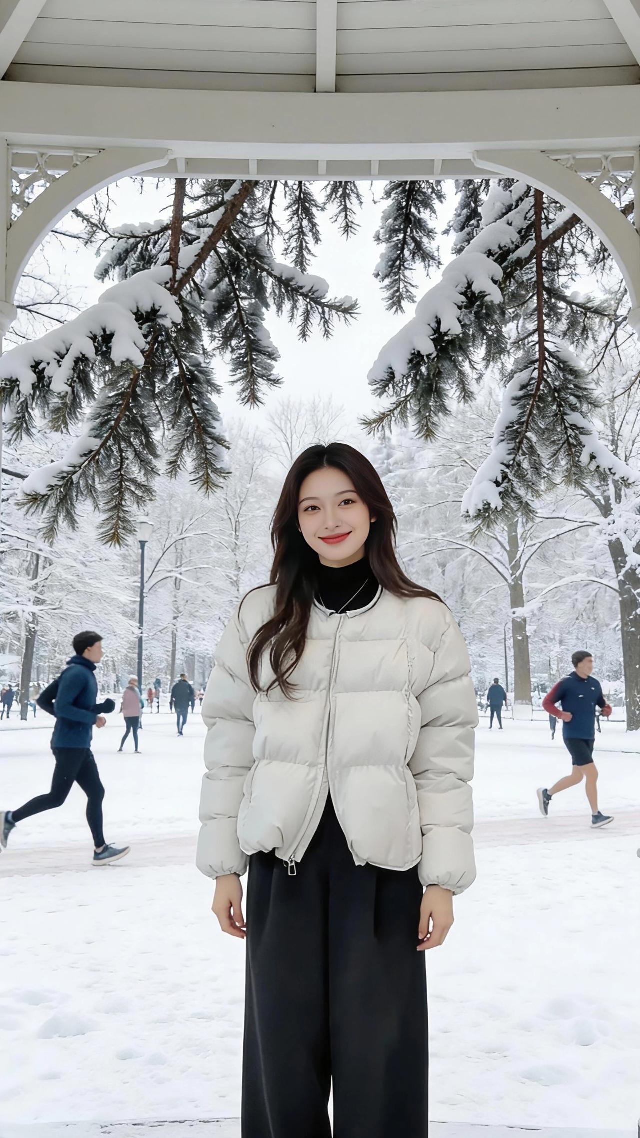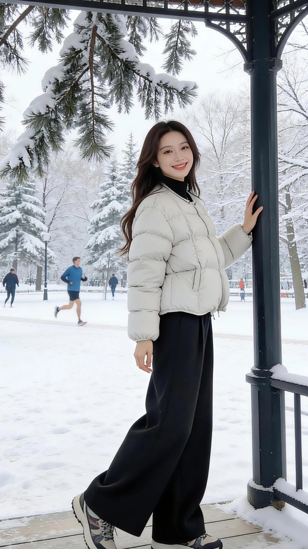雪落满了公园的檐角,连松针都裹着蓬松的白。她立在亭下,米白的羽绒服像团温软的云,裹住了冬风里的轻寒。 黑色阔腿裤垂落得舒展,像把雪天的清冷都衬得柔和。她抬手时,发梢蹭过肩头的绒,笑意比落雪更软——身后有人踩着碎雪慢跑,风裹着松枝的凉,却没吹淡这帧画面里的暖。 原来冬天不是只有冷的,它也会把温柔揉进蓬松的衣摆,藏在亭下抬眸的笑意里,让每片落雪都成了衬景。 高级感穿搭 小个子穿搭 棉服外套 棉服