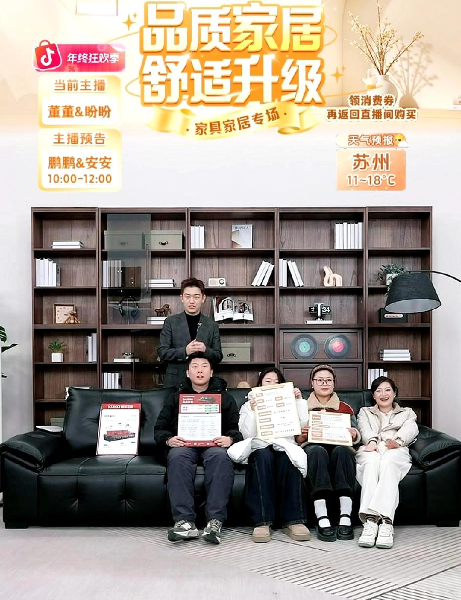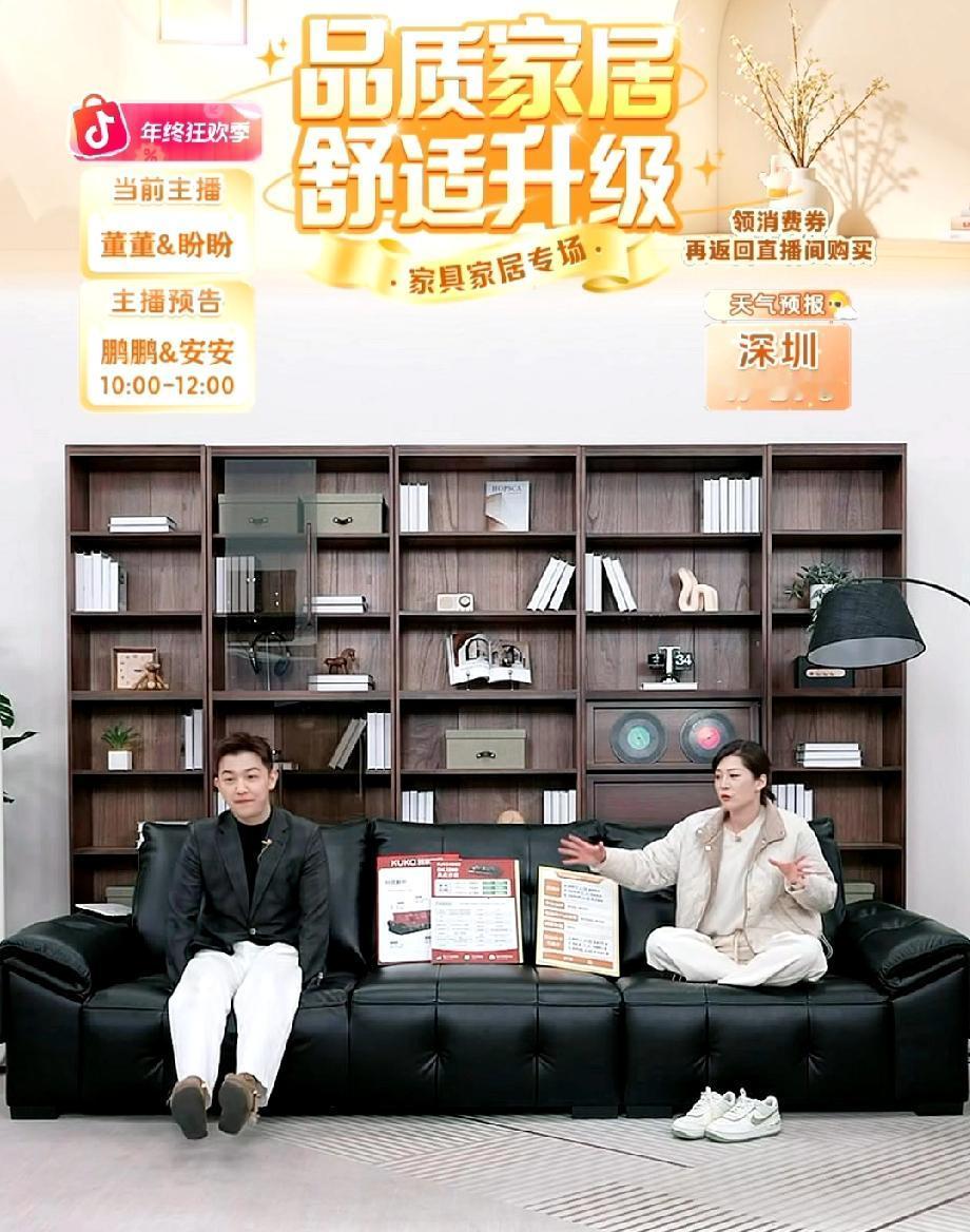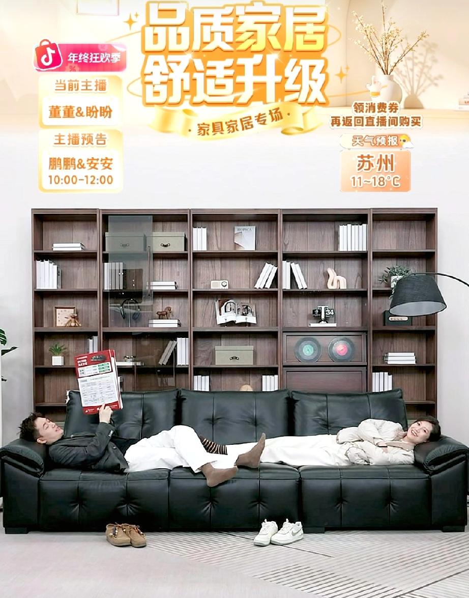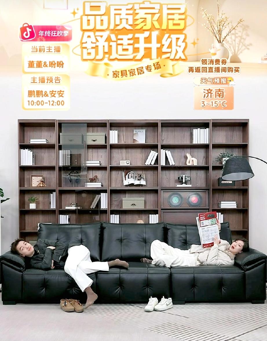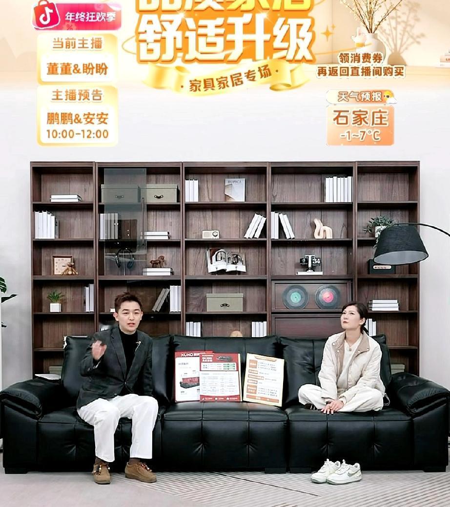 盼盼、董董一起再讲一款沙发,颜值高,价格优。不敢再看了,怕一冲动把家里的沙发给换了。 这是一款黑色的真皮大三人位的沙发,实际上能轻轻松松坐5个人。看起来不管是坐着躺着都很舒服。 这款沙发售后做的也很到位:如果是新房装修可以延迟90天发货;如果是老房换新,可送货上门、安装,还顺带把旧沙发带走。整体三年质保,弹簧框架10年质保。 如果想要买沙发,这款真的是不错的选择。 董宇辉 与辉同行 兰知春序 董董