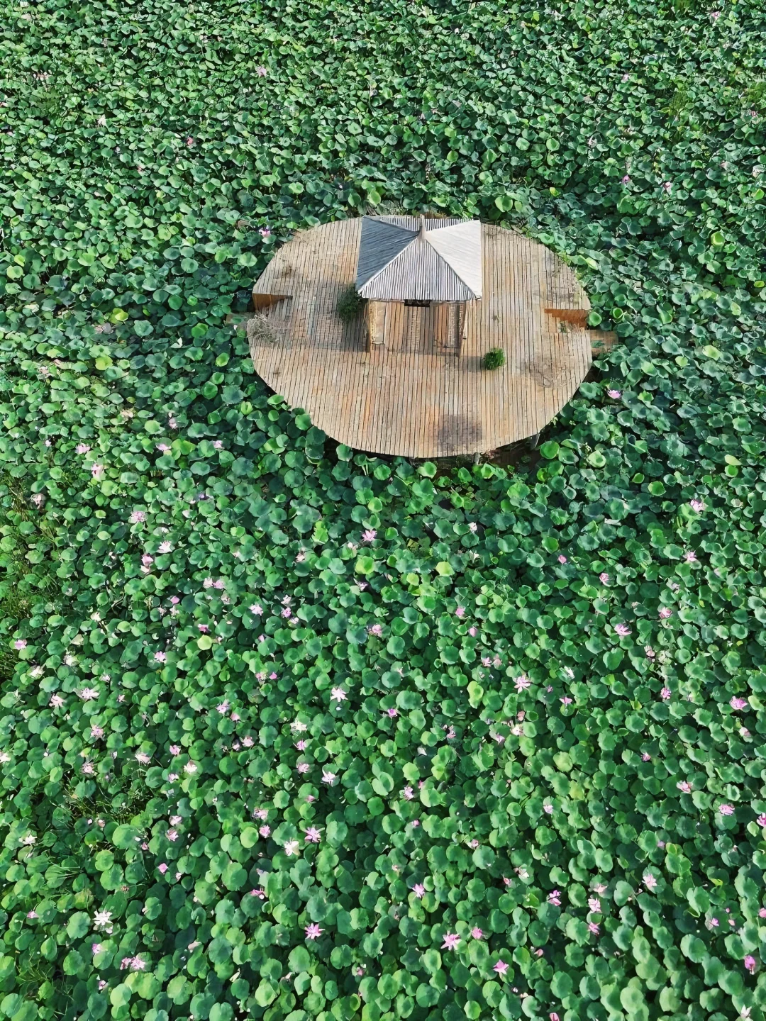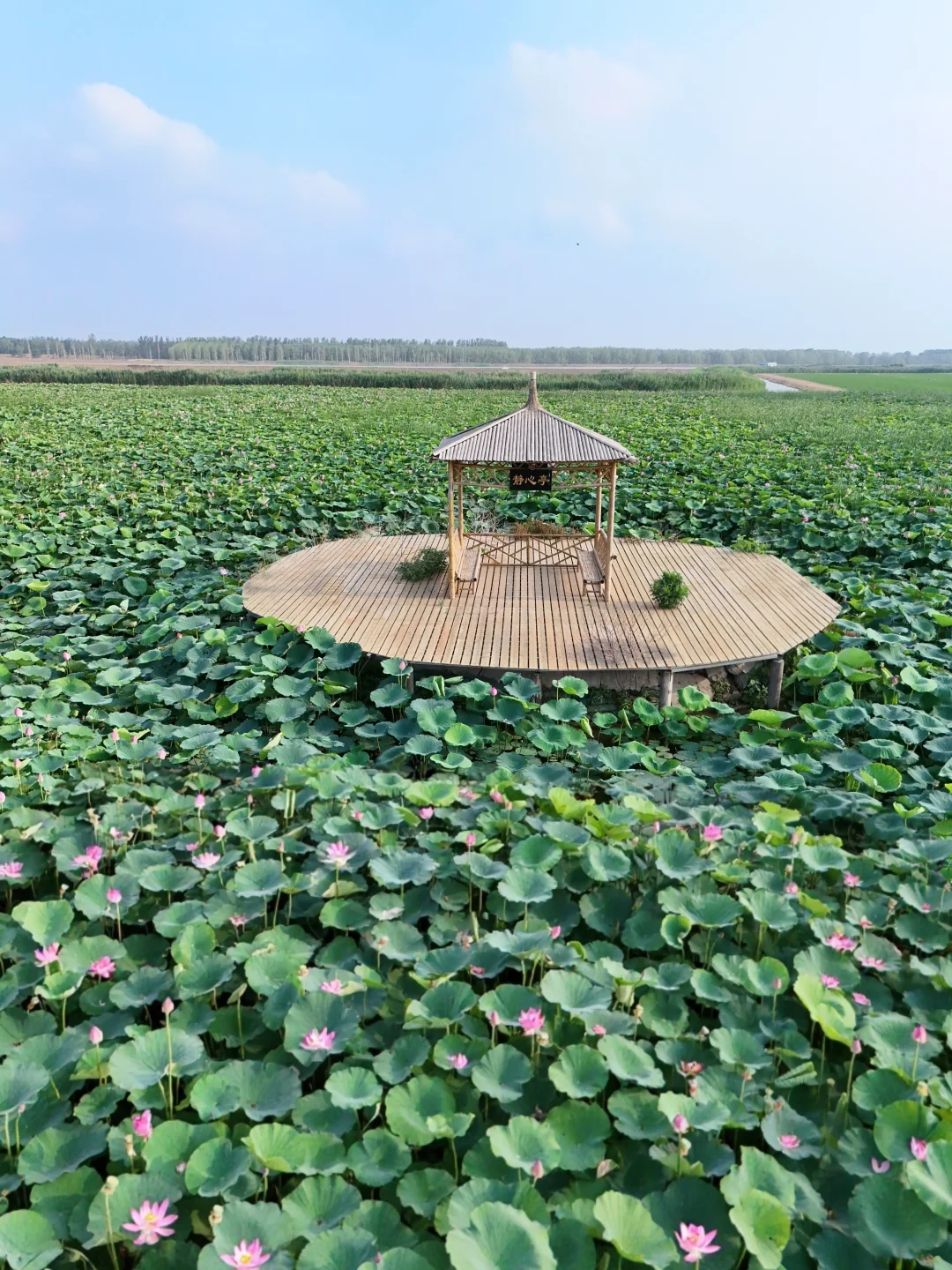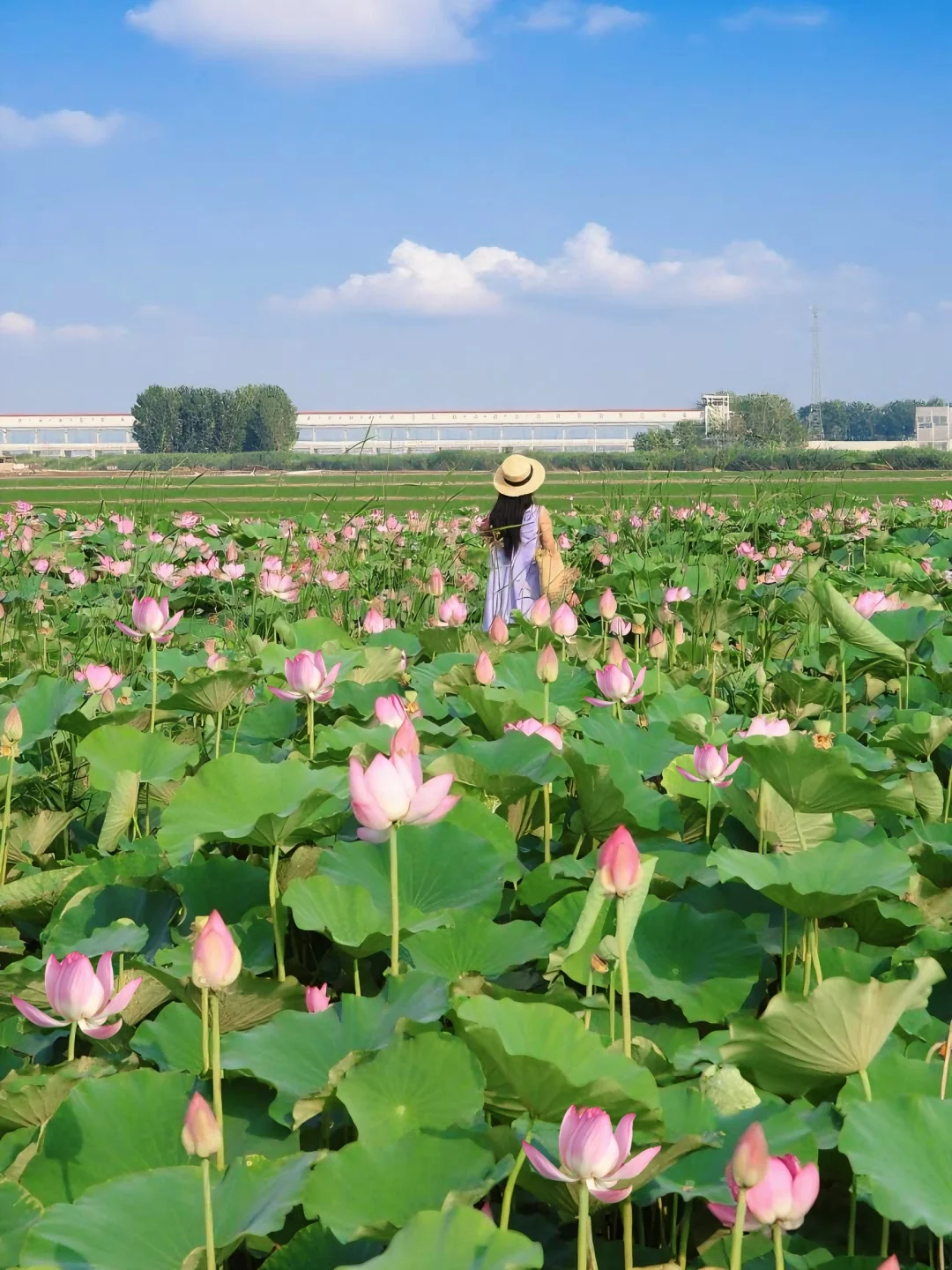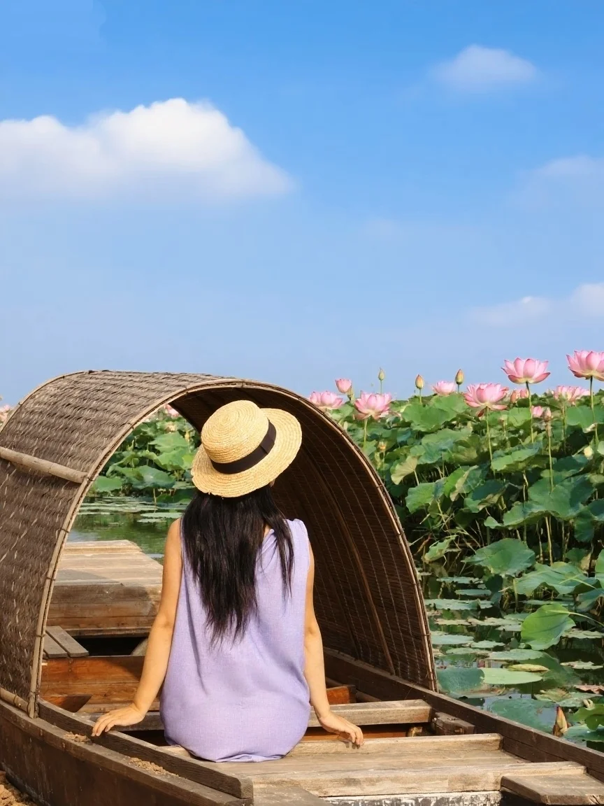 天津也有荷花乌篷船了 现实版误入藕花深处 接天莲叶无穷碧,比南翠屏荷花更壮观 导航📍生态六埠,开到图9的石碑处 没有🎫,免费🅿️几乎没有人 早上9点前荷花开着,下午容易闭合