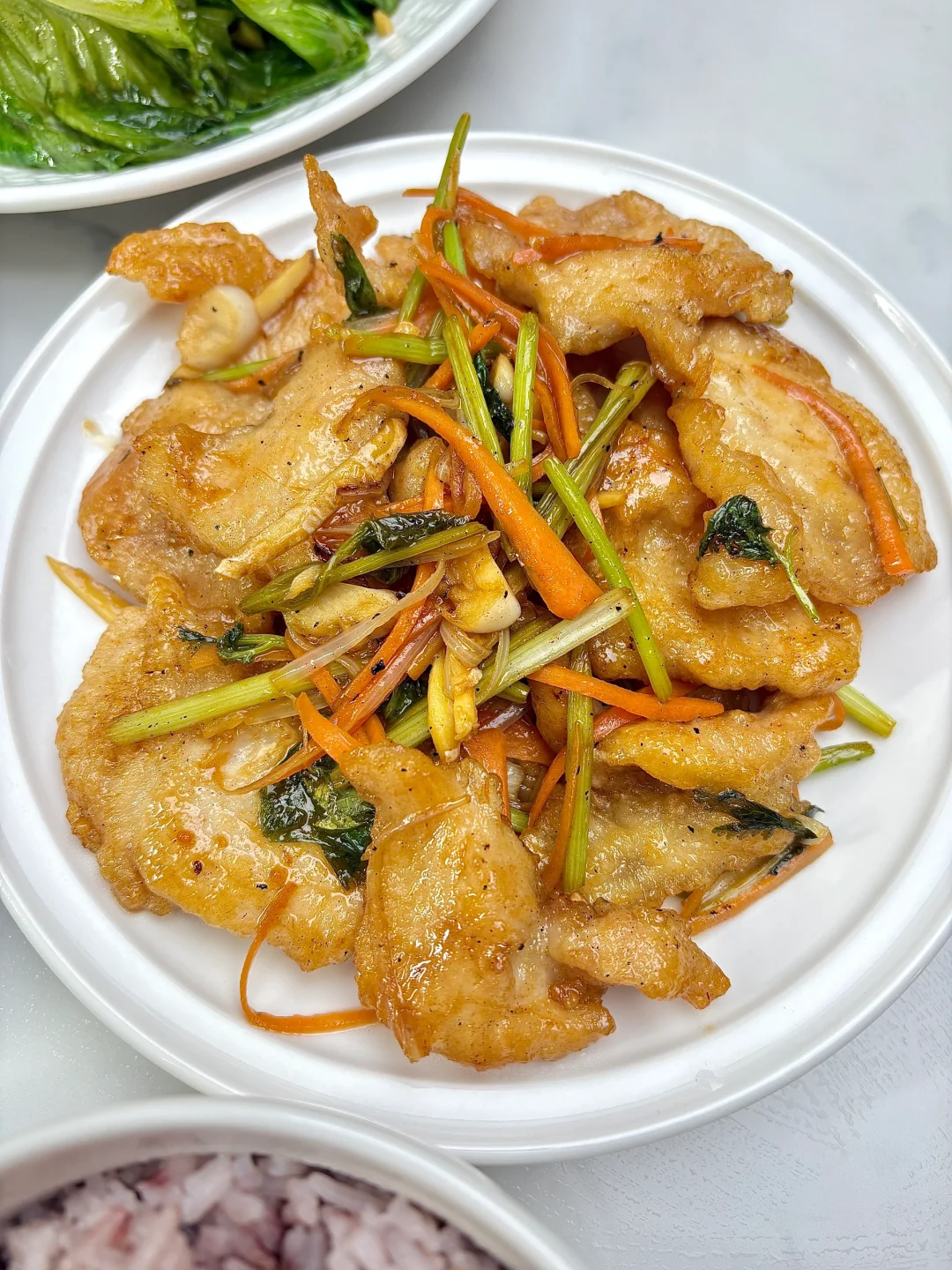 今天晚餐长这样 今日菜单: 锅包肉 番茄炒蛋 蚝油生菜