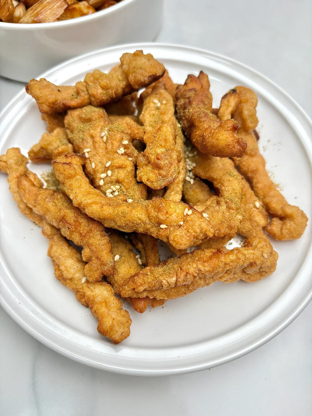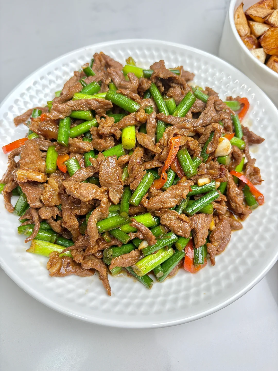 今天晚餐长这样 今日菜单: 蒜苔炒肉丝 炸酥肉 油焖茭白