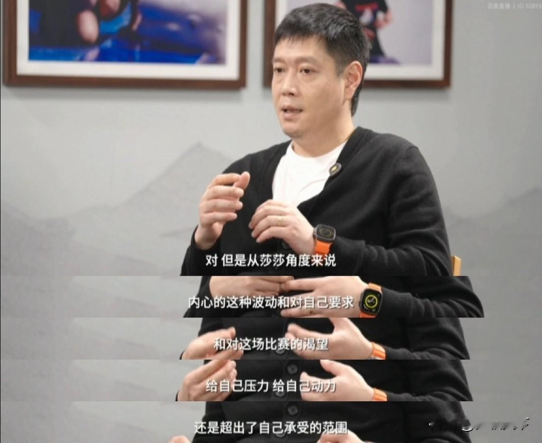 孙颖莎全运会不敌王曼昱的根本原因找到了! 近日, 孙颖莎主管教练邱贻可在接受采访时 谈到孙颖莎下半年的状态有起伏, 邱贻可说, 全运会期间莎莎心理有些波动, 起伏相对偏大。 当谈搭配决赛输给了王曼昱时,表示, 实际上两人的水平都在伯仲之间, 决赛也都展现出了最高的竞技水平。 但最终莎莎输掉了比赛有技术的原因, 但也有心理和认知的原因: 邱贻可说莎莎给自己的压力、 对自己的要求、 对比赛的渴望, 已经完全超出了自己可承受的范围。