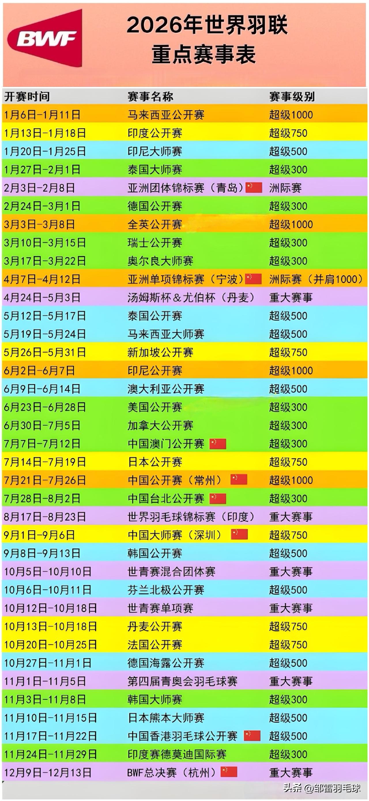 2026年世界羽联重点赛事安排表 时光匆匆,2025年即将画上句号,充满希冀的2026年正缓缓走来。新的一年,世界羽联公布了2026年羽毛球比赛安排表。喜爱羽毛球的球友们,别忘了点赞、收藏、转发哦!感谢朋友们一年来的鼎力支持,在此提前祝愿球友们观赛愉悦。 羽毛球 羽毛球爱好者 羽毛球比赛 羽毛球赛事 羽毛球赛程 羽球赛程 羽毛球赛历