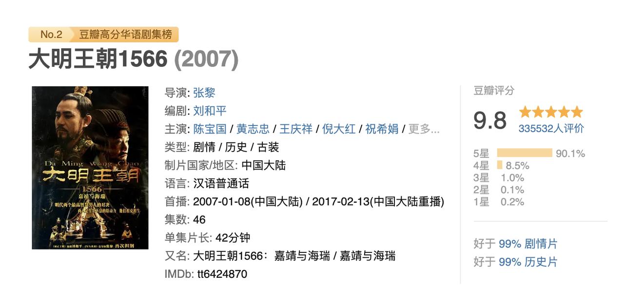 《大明王朝1566》再度翻红! 2007年这部电视剧在湖南台播出的时候,因为时段不对,首播收视率不足0.5%,此后十年这部电视剧,一度被冷藏。 谁能想到后来这部剧会翻红,而且是一路高歌猛进。 直到2025年,这部剧再度闯进大众视野,再次成为天花板级别的电视剧。 这确实让人可喜可贺!