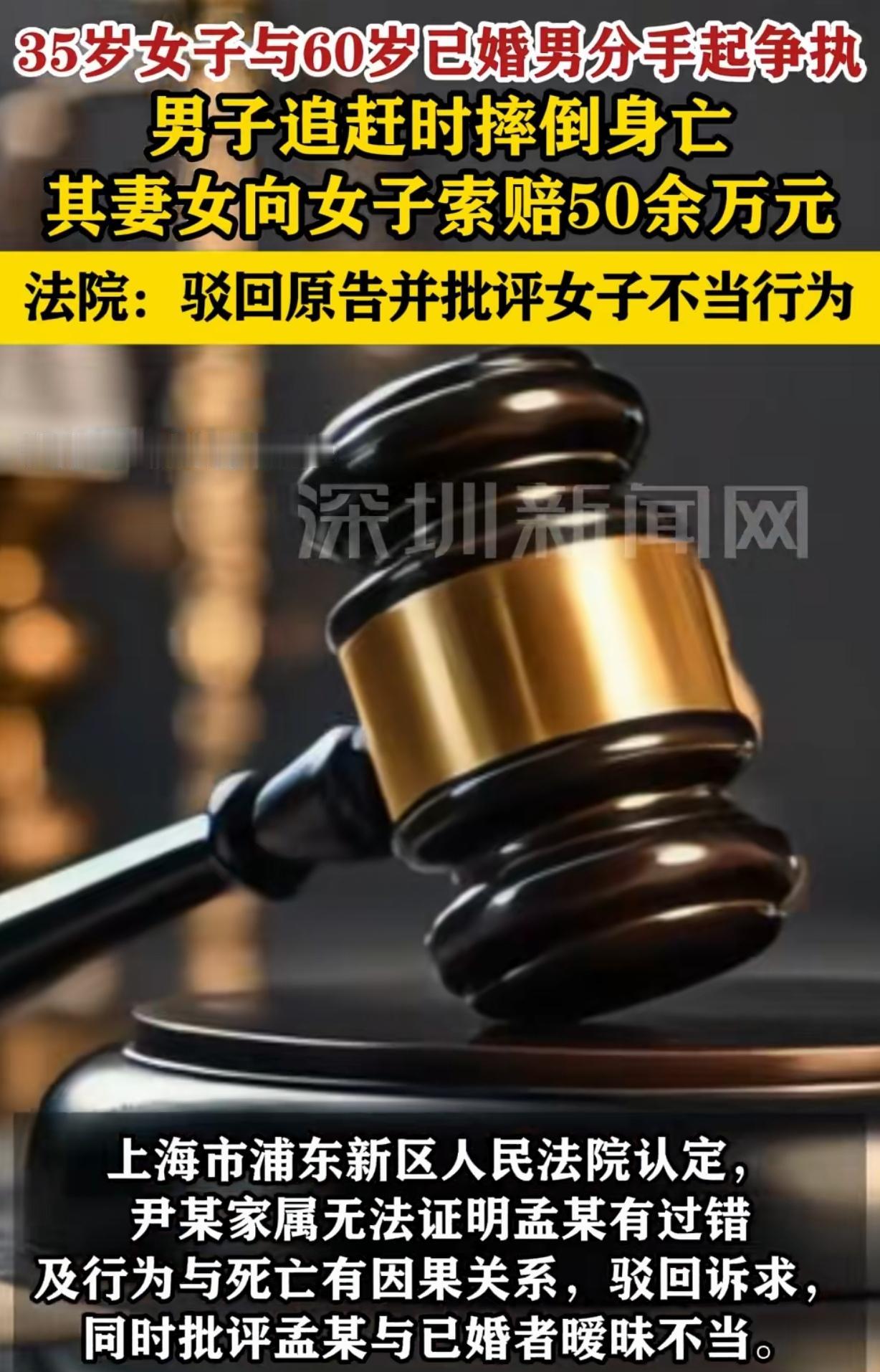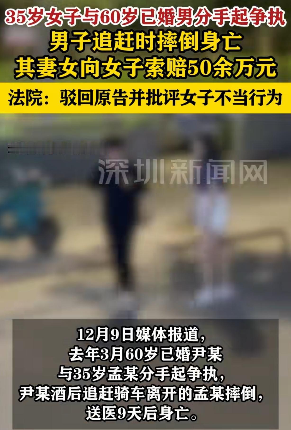 “这就是胡来的结局!”上海,一60岁已婚老头,跟一个35岁女子搞暧昧,2人喝完酒,女子提出一刀两断,骑着自行车就走,心肝宝贝要把自己踹了,老头舍不得,赶紧去追,没想到,老头摔倒身亡,老头的妻女愤怒的把女子告上法庭,索赔50多万,而法院判决:女子只说服教育,一分钱不赔!老头妻女彻底傻眼了。 别看老尹60岁,已经花甲之年了,但他人老心不老,竟然跟一个35岁,叫孟某的女子纠缠在一起,搞起暧昧。 在老尹看来,人生苦短,就应该及时行乐,家里的老伴像蔫巴茄子,而孟某正当年,是一个女人最魅力四射的年纪,自己土埋大半截了,能跟这样美好的女子发生感情,那真是脸上有光,光宗耀祖了。 于是,老尹使出浑身解数,当年,他也是这么对自己老伴的,拿捏女人他有经验。 果不其然,孟某被老尹征服,不顾年龄差距,跟他走到一起。 新鲜了一段时间,代沟就出来了,保鲜期一过,孟某心生厌倦,觉得自己真是脑袋进水了,怎么会看上老尹,一身的老年味,满口的假牙,想想都反胃。 于是,孟某想结束这不伦不类的关系,决定找个机会摊牌。 2024年3月,朋友组局吃饭,其中就有老尹和孟某。 酒过三巡,吃饱喝足,大家又去了KTV,聚会散场,老尹和孟某一起打出租车离开。 孟某觉得机会到了,于是下车后,她跟老尹提出分手。 这太突然了,老尹还做着要跟孟某长相厮守的梦呢,她却要决绝离去,他压根受不了,也不同意。 孟某可再不想跟这个老头子有啥瓜葛,她态度坚决,不管老尹同不同意,她又不是跟他商量,只不过通知他而已。 于是,孟某说完,骑上共享单车就扬长而去。 老尹心碎欲裂,赶紧去追,因为自己一把年纪了,再加上情绪起伏很大,又喝了酒,脚下一个趔趄,就摔倒在地。 不管老尹服不服老,他也是花甲之年了,老人最怕摔,他也一样,这一跤导致他昏迷不醒,路过的好心人拨打了120,老尹送医后抢救9天,因心脏呼吸衰竭身故。 老尹的妻女悲痛欲绝,追根溯源,发现老尹背叛了家庭,而他的突然离世,跟第三者孟某有关,要不出了这档子,妻女还被蒙在鼓里。 妻女人为,老尹的死,孟某脱不了干系,她明知老尹有妻女,竟然还插足别人家庭,这是一宗罪。 其二,孟某明知道老尹醉酒,提出分手刺激到了他,不把他送回家,还半路把他扔在路边,没尽到安全保障义务,毕竟他们在一起吃饭喝酒了。 老尹要不是去追骑共享单车离开的孟某,怎么可能摔倒?怎么可能出事?孟某应该知道,60岁老头,即使不喝酒追车都可能发生意外,何况他酒后?所以,跟孟某索赔50多万,只少不多。 可孟某却觉得自己太冤,在她看来,老尹当时没喝多,打出租车后,跟司机说话,口齿清楚,毫无醉意。 车没到地方,孟某就让司机停车了,她想跟老尹提出分手,刷共享单车骑回家,但老尹不同意,他们又走了一段路,她继续表明自己分手的决心后,骑着共享单车走了。 因为孟某开着手机语音导航,所以她没听到老尹摔倒,否则她不会冷漠离开,而且,饭局不是她组织的,吃饭时也没劝老尹喝酒,他的离世跟自己无关。 法院判决:孟某与有家室的老尹之间关系暧昧,实属不该,应当予以严肃批评教育,无需赔偿。 有人为这个案例做了首打油诗,让人忍俊不禁:摔死方知万事空,女子离开心不同,家属要钱不知臊,是非曲直应理清! 这种男人,应该是回归家庭安享晚年的时候起火,玩不利索,言面尽失,还丢了命,一言难尽。男人还是要自重。 老尹为老不尊地离世,也就算了。这妻女非得把这桩儿丑事宣扬出来,唯恐大家不知道……有枣没枣打一竿子,暧昧不算出轨吧,那对她老头笑一下也算有罪呢? 不去评论事情的对和错,只是想说现在有一种现象:不管是喝酒出事的,还是溺亡的,摔倒的,各种死的,总能找到索赔对象,可是作为一个成年人有自己的独立思维,在没有人强迫或强制你干嘛的前题下,出来个什么故事,就该自己负责。 《民法典》第1165条第1款规定:行为人因过错侵害他人民事权益造成损害的,应当承担侵权责任。 法院判决孟某不承担责任的核心在于侵权责任4要件没成立。 孟某与尹某同车离开系自愿行为,她骑共享单车离开不构成法律禁止的作为或不作为。 尹某作为完全民事行为能力人,饮酒后自身负有安全注意义务,孟某非聚餐组织者或劝酒人,亦无法定或约定的护送义务。 原告主张孟某“间接故意”缺乏证据。法院查明孟某离开时尹某意识清醒、能与司机正常交流,其无法预见尹某追赶会摔倒身亡,故不存在故意或重大过失。 尹某死因是“心脏呼吸衰竭”,与追赶行为无直接医学关联,且摔倒发生在孟某离开后,其行为与损害结果之间无法律因果关系。 法院驳回原告诉请符合《民法典》第1165条“过错责任原则”。即使孟某的道德瑕疵,受法院批评,但道德责任不等于法律责任,法律会严守“过错与责任相适应”的界限。 关注@灋律盐究员 学法辩是非用法止纷争。