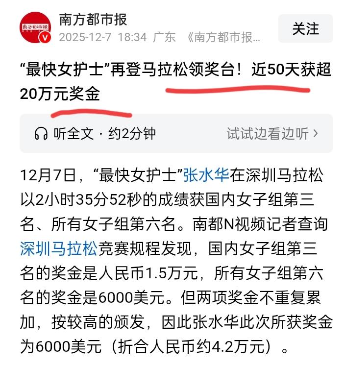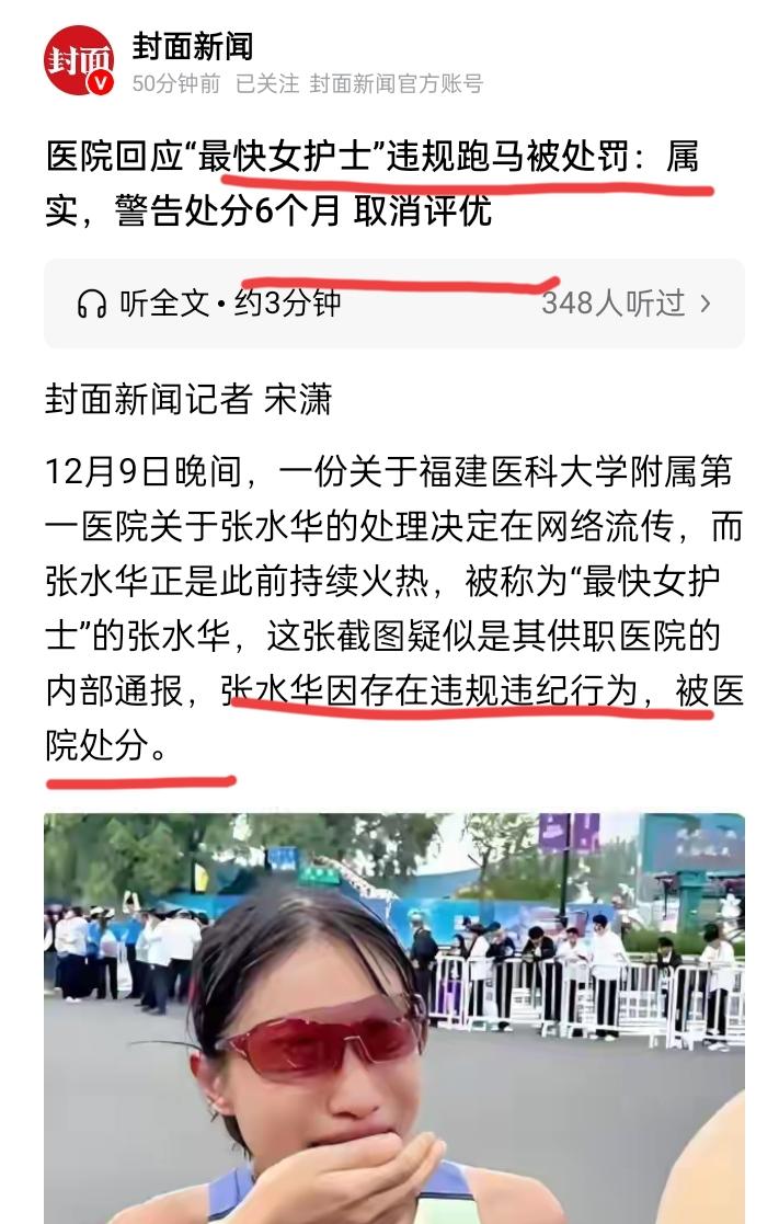 那位跑步跑的非常快的“女护士”终于还是等来了所在医院的处罚通告!原因是违规跑马拉松,在外面做兼职违反医院的规定!被警告处分6个月不得评优! 但谁又能想到在医院做护士的她,平时辛辛苦苦拿着微薄的薪水,通过参加跑步马拉松比赛在短短不到两个月的时间,就拿到了50万块的奖金呢? 这相当于她在医院最少要干5-10年才能拿到的工资,所以为什么她要跟医院请假去参加比赛,出于爱好以外,拿奖励才是重点啊!女护士跑马拉松 中国马拉松女子 护士马拉松