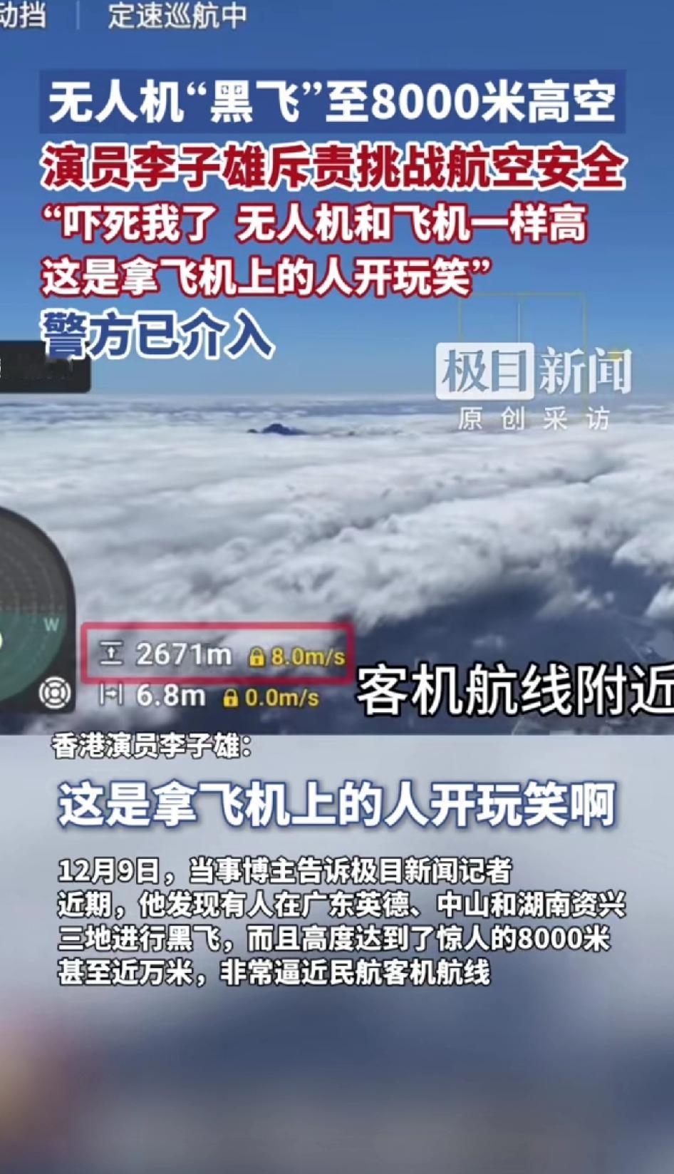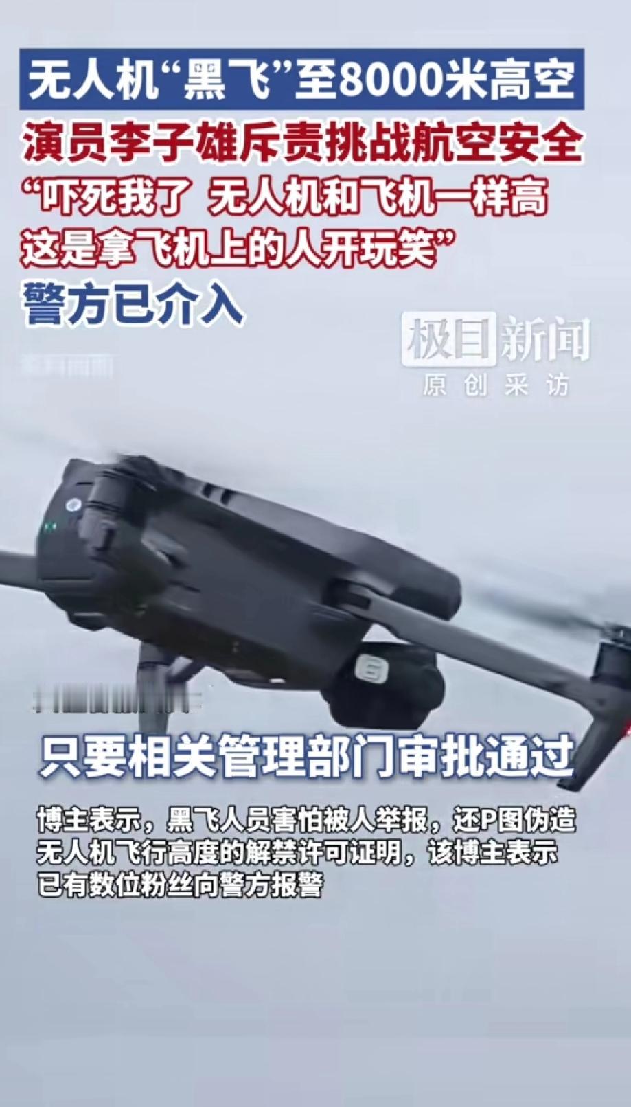 演员李子雄斥责无人机“黑飞”至8000米高空,挑战航空安全。 他刚乘机过来,看到相关“黑飞”视频后直呼“吓死我了”。 原来,一名地图分析博主发布了广东、湖南等地的“黑飞”解密视频,经分析,这些无人机冲破云层,基本都在8000米以上高度飞行,甚至逼近万米高空,而这可是民航航线所在高度。 李子雄:吓死我了,无人机跟飞机飞一样高,这是拿飞机上的人开玩笑。 “黑飞”者还贴出所谓合法飞行凭证,但真实性存疑。 以中山为例,“黑飞”当天近百架次航班从头顶飞过,航线密集。 大疆客服称日常飞行不超120米不用报备,超了就得申请解禁。“黑飞”是对公共安全的直接挑衅,必须严肃对待! 虽然我没坐过飞机,但无人机飞8000米确实太危险了。 不要不把别人的生命不当回事,出了事谁也担不起责任。