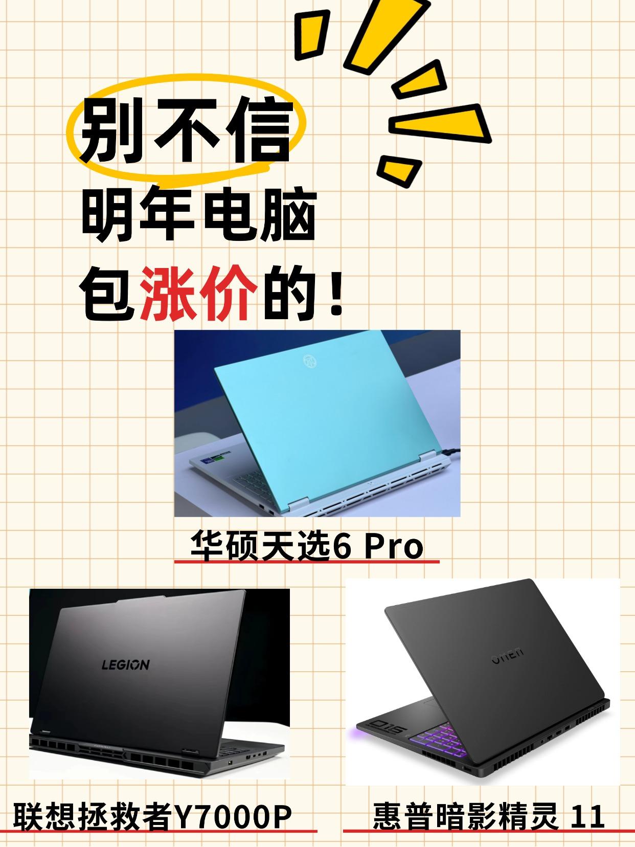 别不信,明年电脑包涨价的 真的不是制造焦虑,这阵子种种迹象都在说明,明年PC要猛涨价!! 一是内存、存储价格已经涨过一轮,厂商也陆续放话要调价,明年新机大概率更贵,😭不是配置缩水就是直接加钱。现在看着贵的,很可能已经是低点价了。 二是硬件更新幅度很有限,RTX60推迟后,RTX 50 独显还得继续扛,明年游戏本基本是小年,CPU换代、功耗微调,性能别抱太高期待。 三是补贴问题,今年国补基本没了,但最近一些政补还能直接吃满两千,💡反而更适合刚需上车。 所以,如果有打算换一台高性能游戏本的,今年双十二这几款一线大牌RTX5060游戏本完全可闭眼冲:👇 ✅华硕天选6 Pro 优势是轻薄高颜值+长续航。而且它是三台里面唯一一个用上最新一代 英特尔酷睿Ultra 7平台的,新平台带来了更好的能耗比,配合它的设计,非常适合对颜值和移动性有要求的用户!价格也很有竞争力。 ✅联想拯救者Y7000P 性能释放强劲,散热稳,适合追求极致游戏帧率的玩家。 ✅惠普暗影精灵 11 不到8K就能拿下RTX 5060的配置,预算卡得比较死的学生党可以重点考虑! 双十二笔记本推荐 华硕天选6Pro RTX5060 游戏本