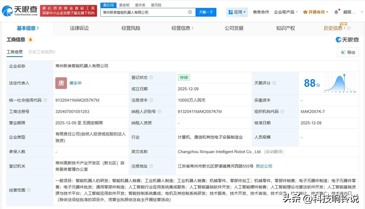 【新泉股份成立智能机器人公司 注册资本1亿】 天眼查App显示,近日,常州新泉智能机器人有限公司成立,法定代表人为唐志华,注册资本1亿人民币,经营范围包括智能机器人的研发、工业机器人制造、人工智能行业应用系统集成服务、人工智能基础软件开发等。股东信息显示,该公司由新泉股份(603179)全资持股。 天眼查信息:
