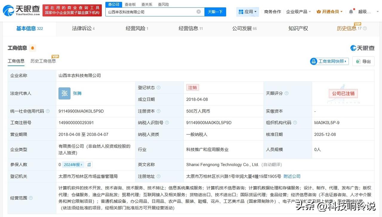 【顺丰控股旗下山西丰农科技公司注销】 天眼查App显示,近日,山西丰农科技有限公司登记状态由存续变更为注销。此前,该公司已发布注销备案公告。 该公司成立于2018年4月,法定代表人为张腾,注册资本500万人民币,经营范围包括仓储服务、渔业产品批发、贸易代理、食品经营等。股权全景穿透图显示,该公司由顺丰控股(002352)旗下深圳市丰农科技有限公司全资持股。 天眼查信息: